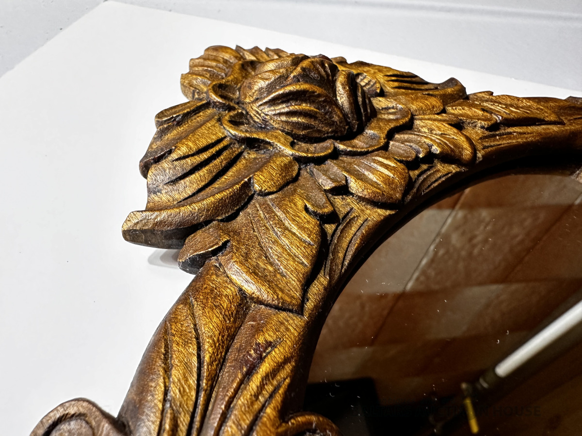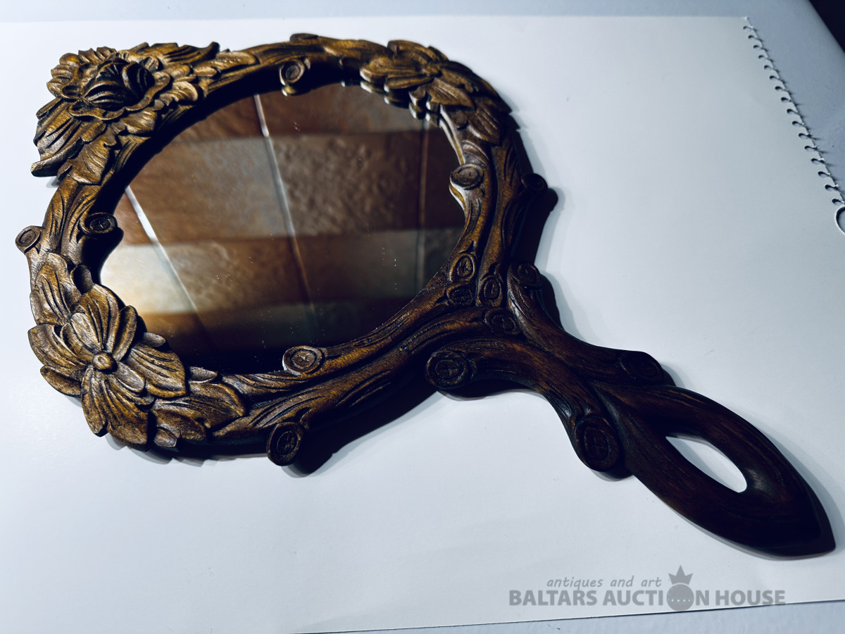 Vintāžas rokas spogulis, kokgriezums, roku darbs, autora parakstīts, izgatavots 1982.gadā pēc 18/19.gds. spoguļu parauga, renovēts 2020.g. Ideāla kondīcija, no kolekcijas. Lielums 39x24 cm.