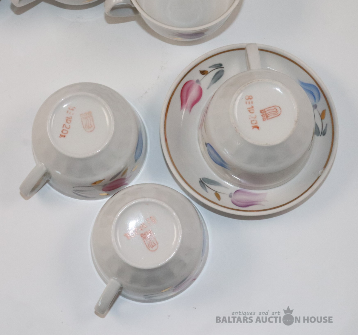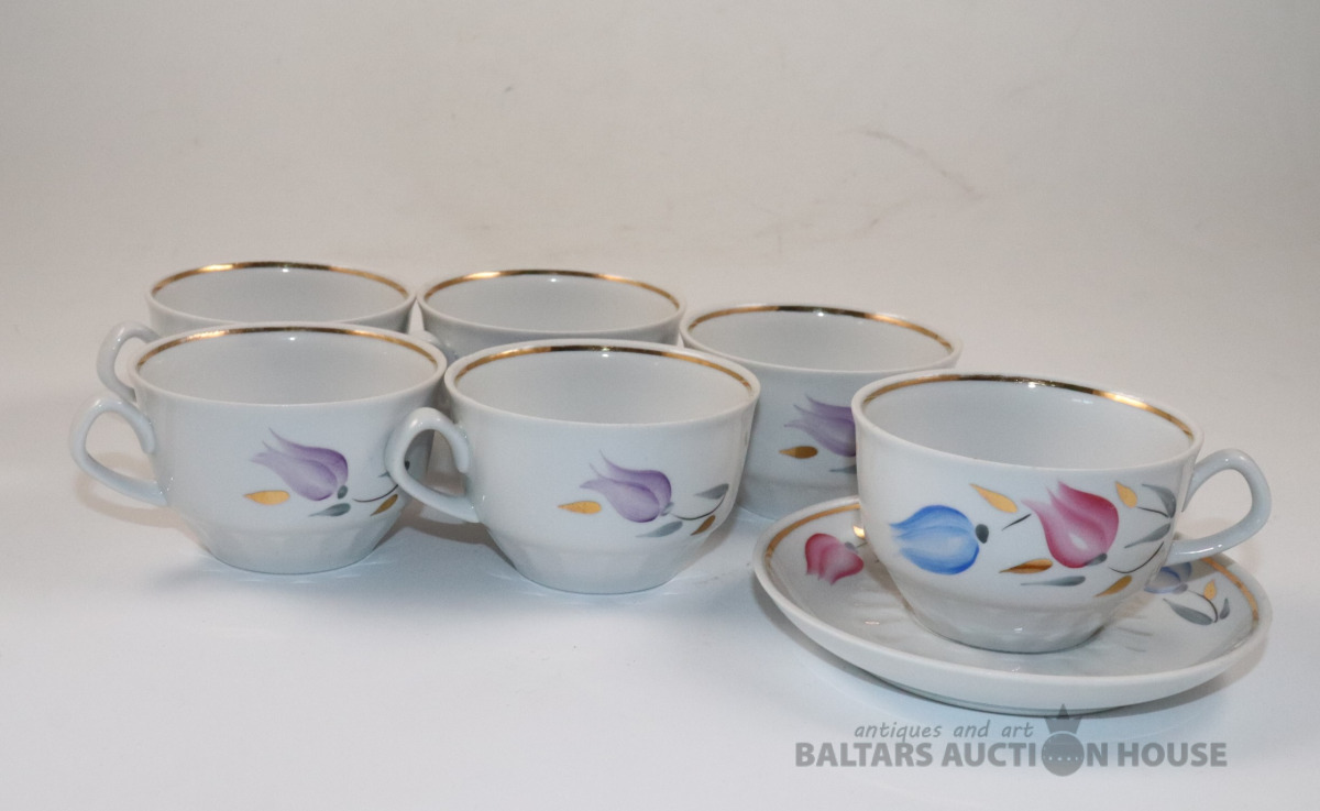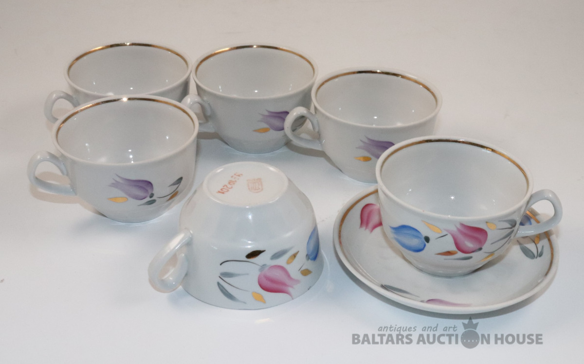 Tases 6 gab. ar apakštasi 1 gab. Porcelāns, RPR. h=5,2 cm. d=8 cm, apakštases d=12,2 cm
