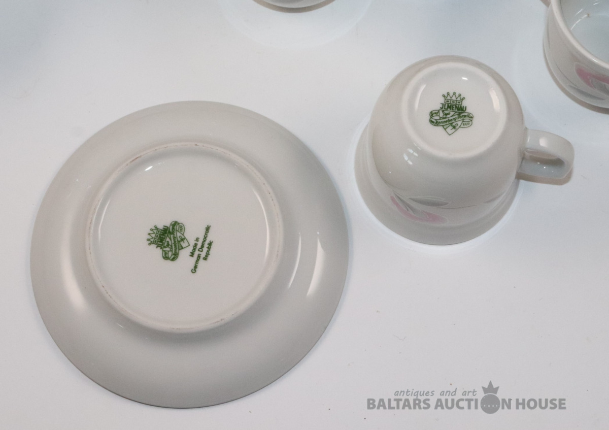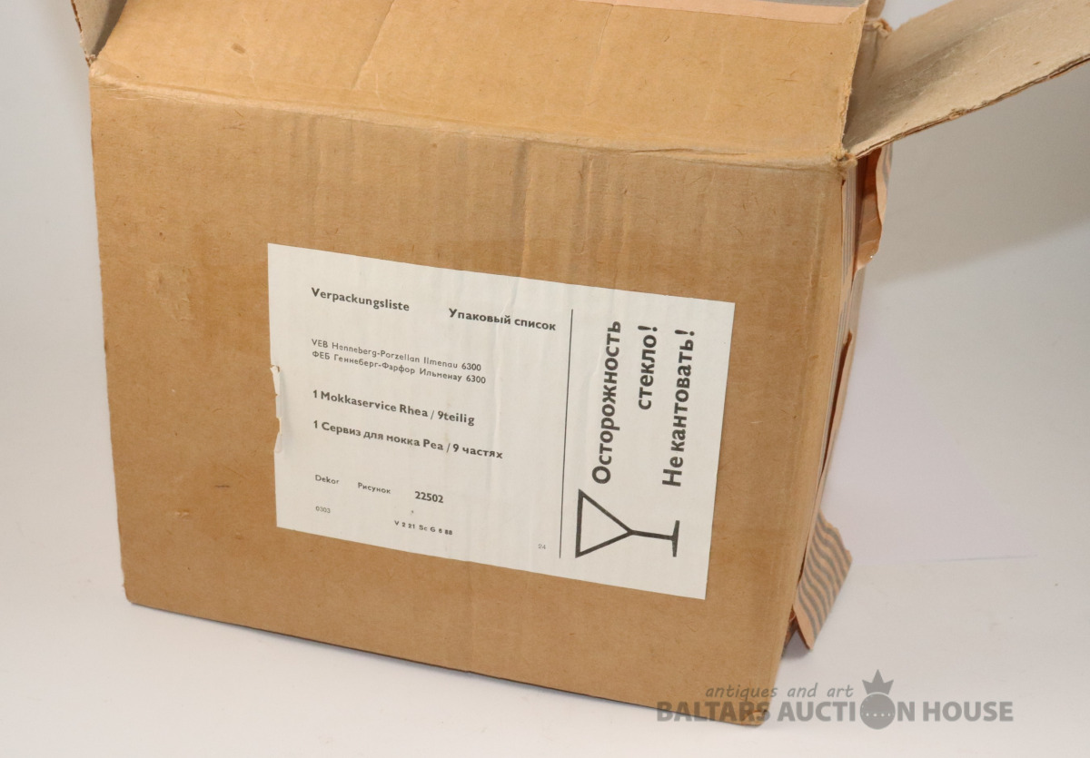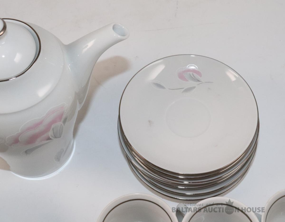 Servīze 7 personām. Porcelāns, dekols. JLMENAU Graf Von Henneberg Porzellan. Tases h=5,4 cm, d=5,9 cm. Apakštases d=11,3 cm. h=7,5 cm, 8,2 cm un 16,7 cm. Ar iepakojuma kasti.