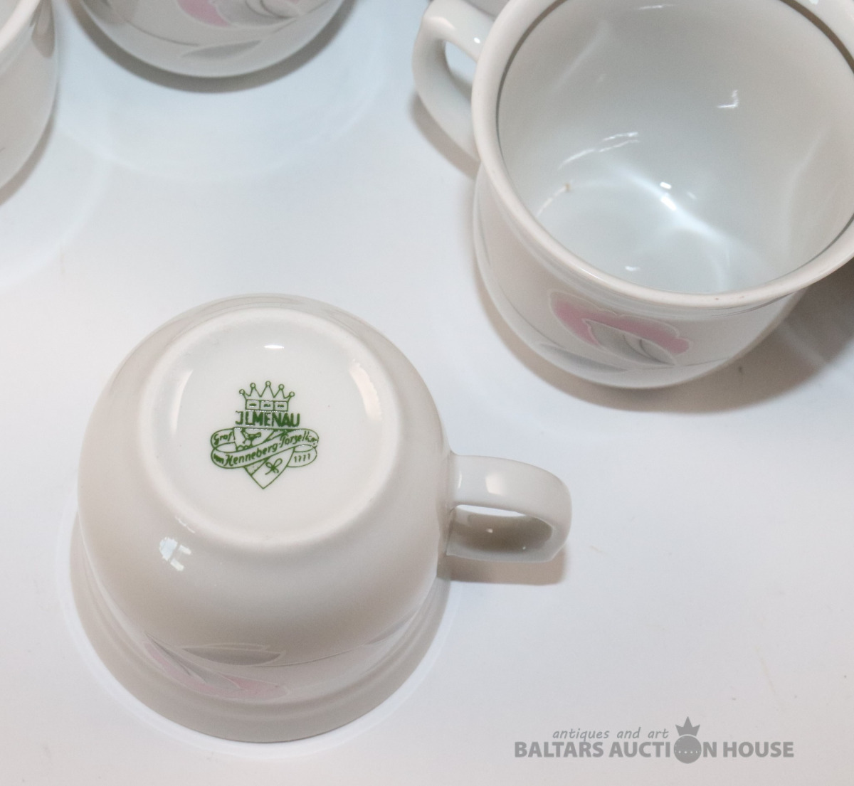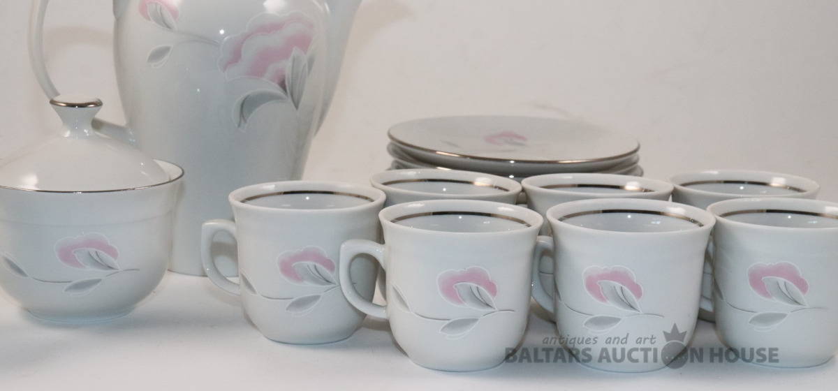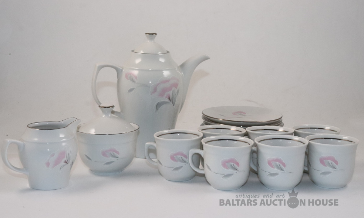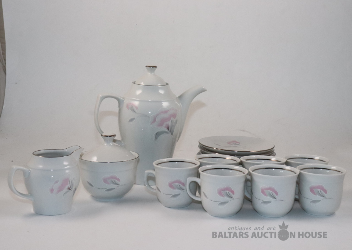 Servīze 7 personām. Porcelāns, dekols. JLMENAU Graf Von Henneberg Porzellan. Tases h=5,4 cm, d=5,9 cm. Apakštases d=11,3 cm. h=7,5 cm, 8,2 cm un 16,7 cm. Ar iepakojuma kasti.