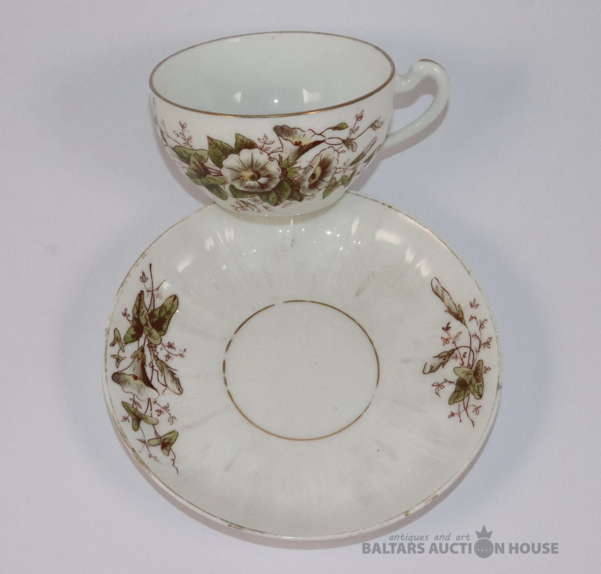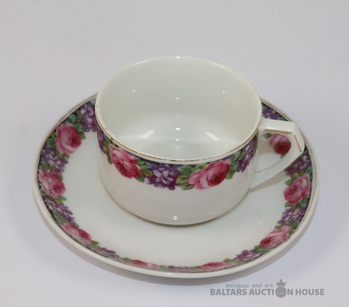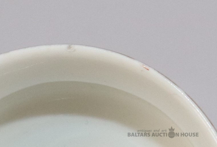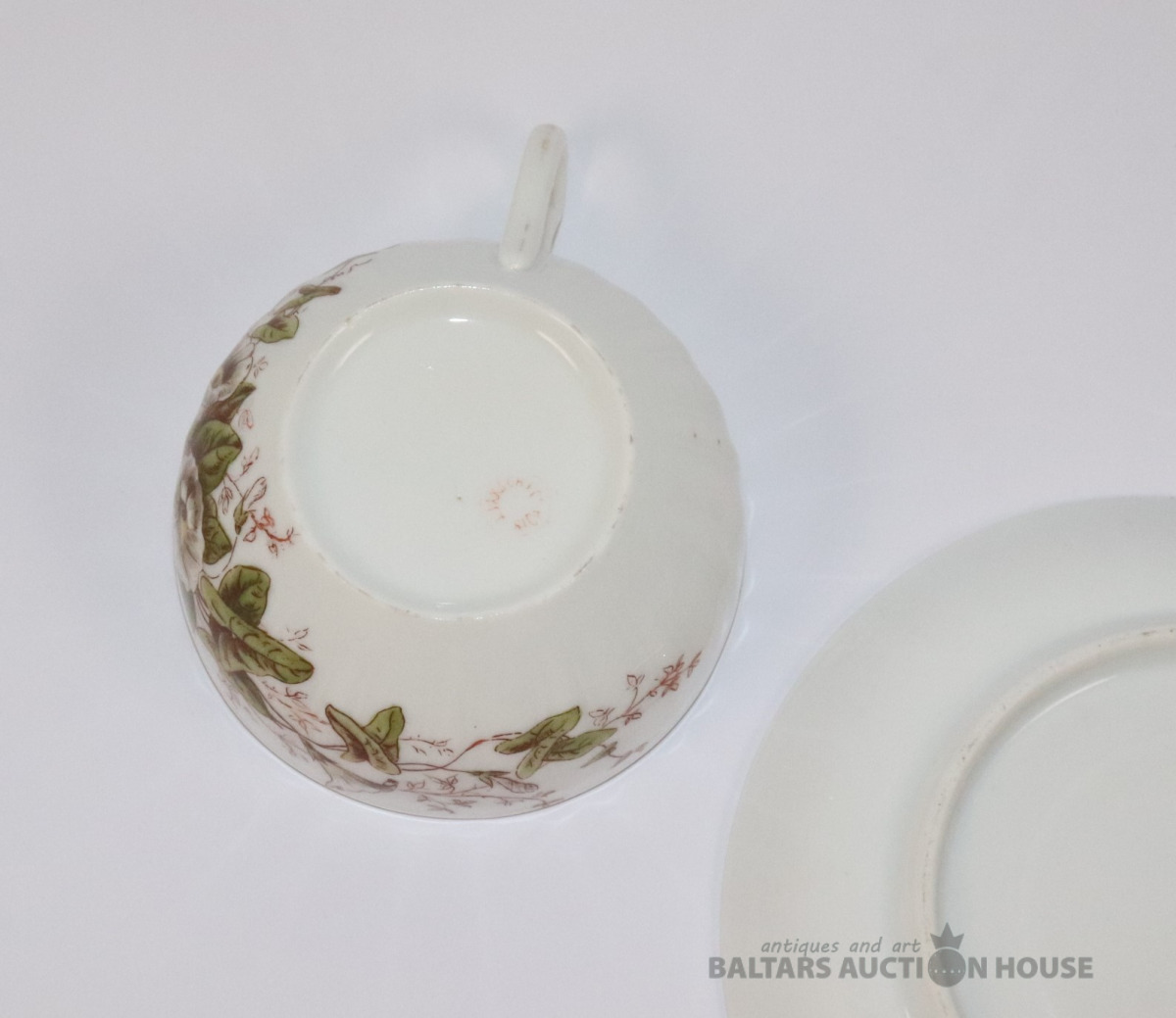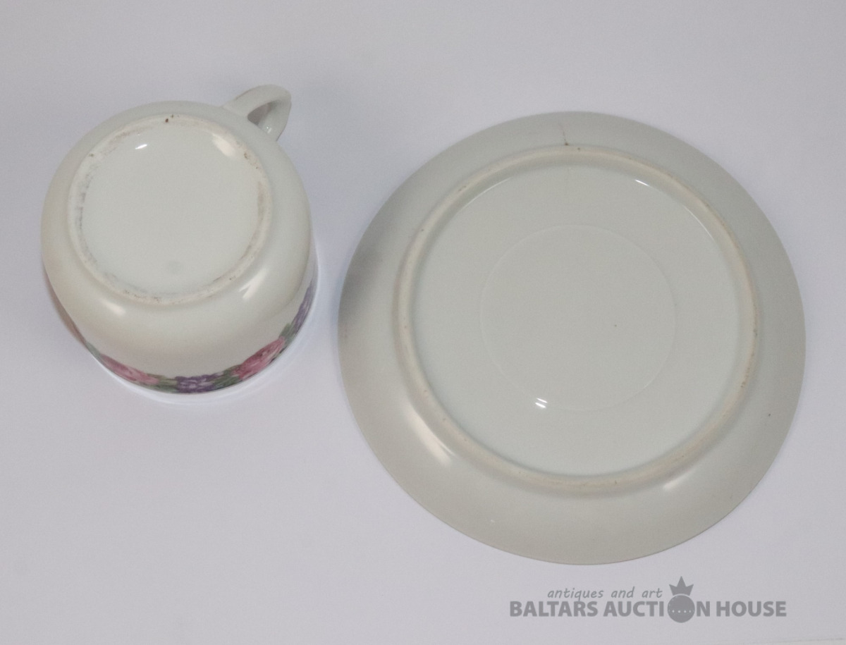 Tase ar apakštasi. Porcelāns, dekols. h=5,2 cm, d=7,8 cm. Apakštases d=14,2 cm. Apakštasei plaisa.