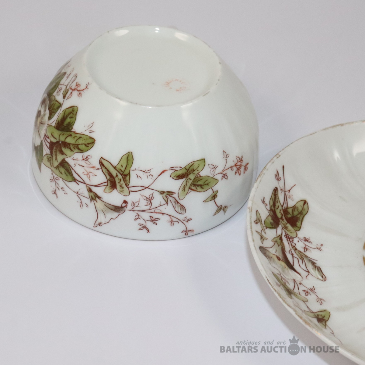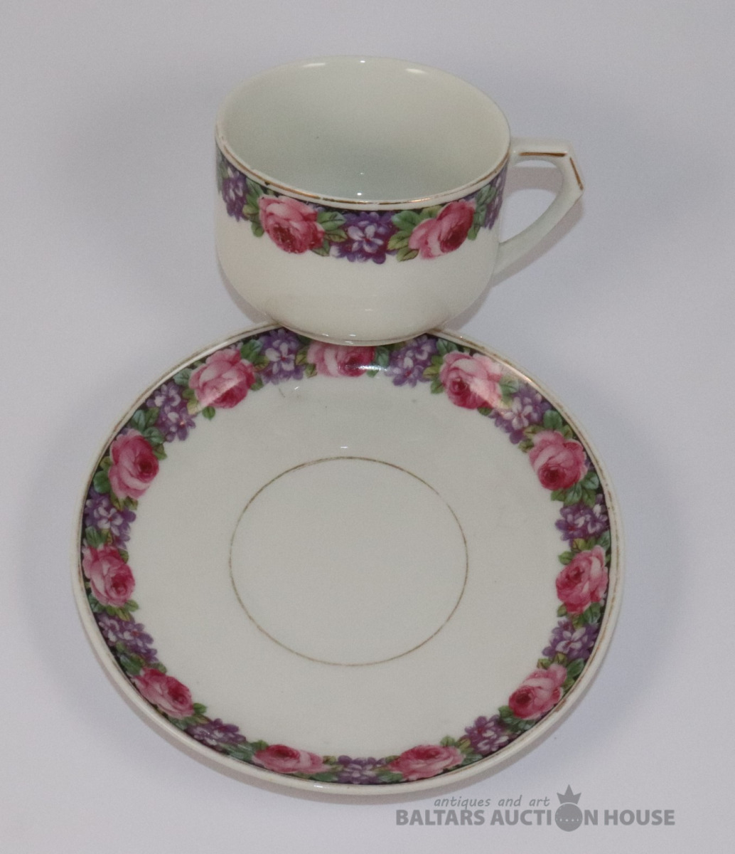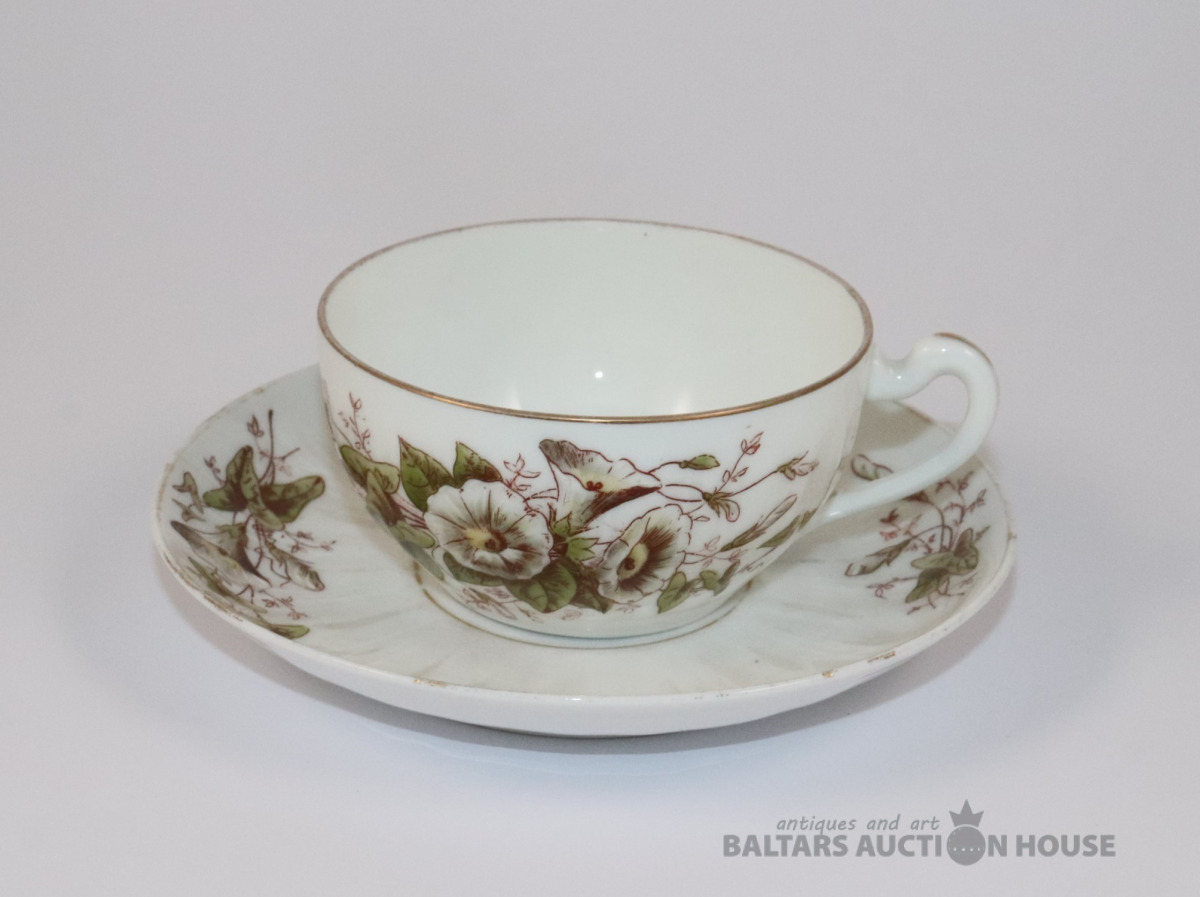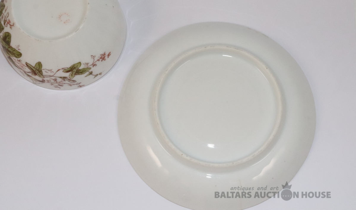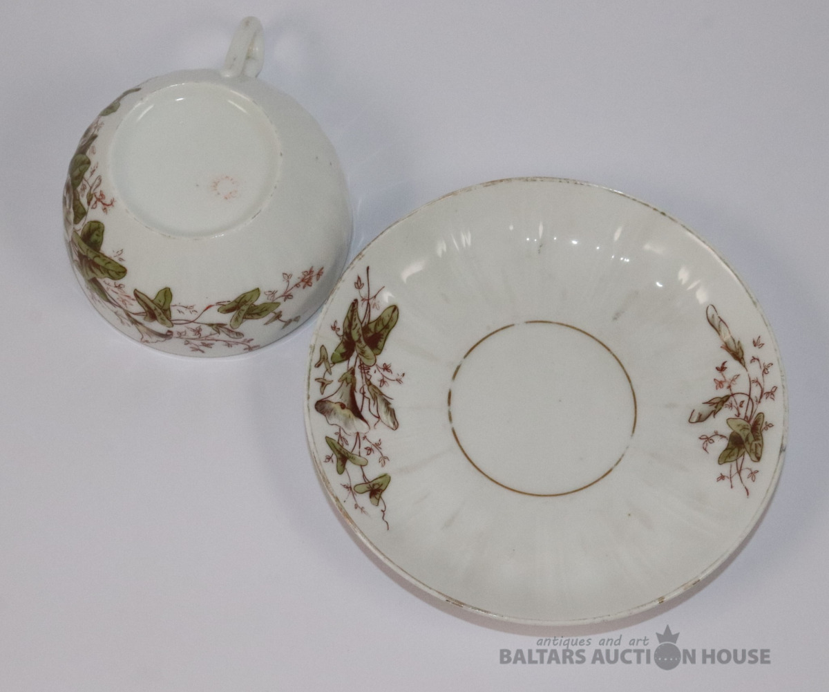 Tase ar apakštasi. Porcelāns. Jaksch & Co. h=4,7 cm, d=9 cm. Apakštases d=14,2 cm. Apakštasei plaisa.