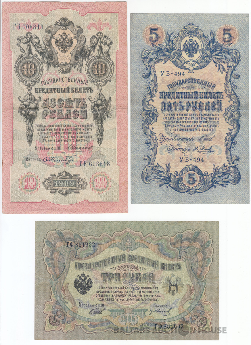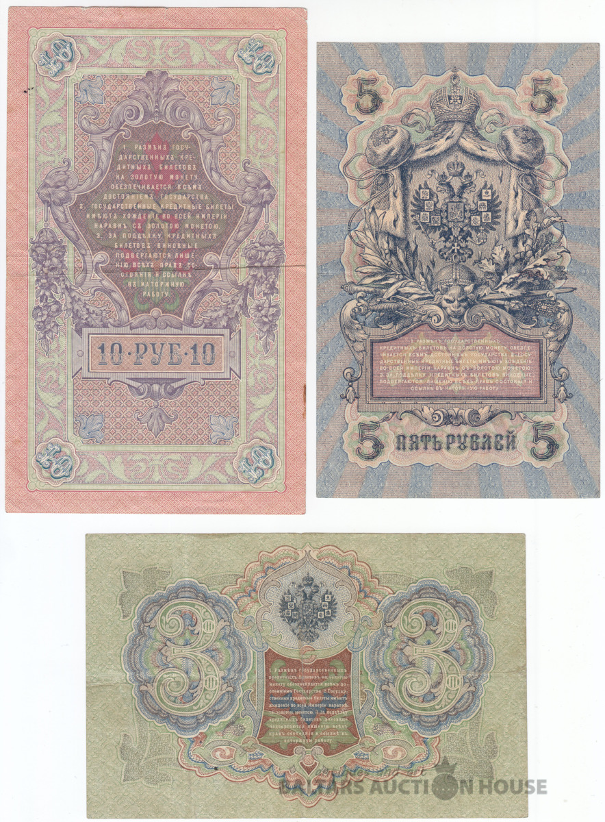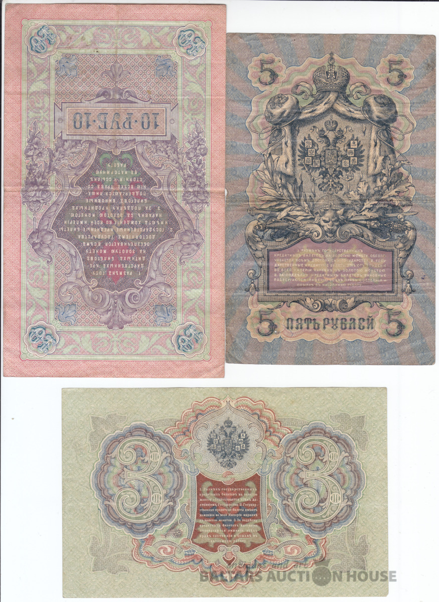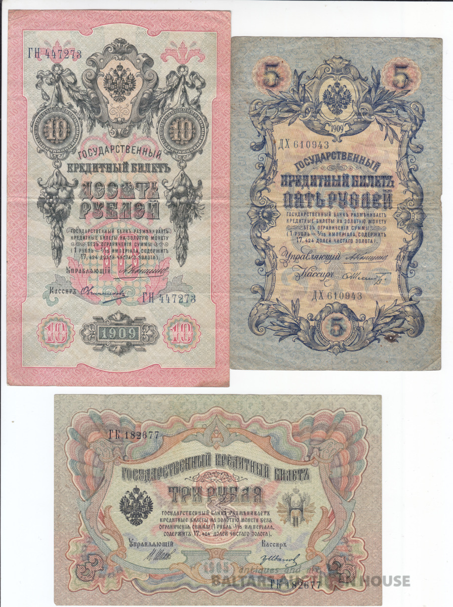 Banknotes, Krievijas Impērija, 10 Rubļi - Paraksts Konšin; VF+/aXF, 5 rubļi - Šipov, aUNC; 3 rubļi - Šipov, XF