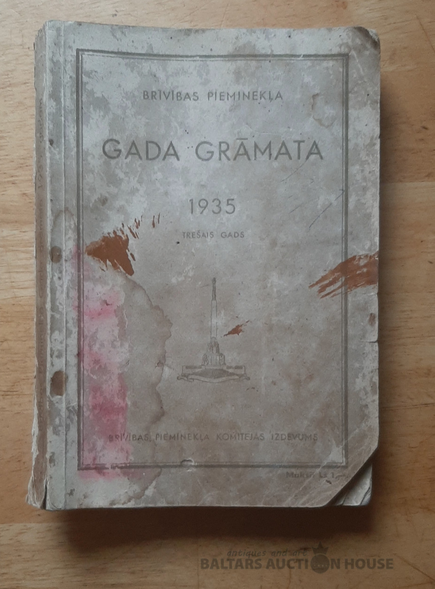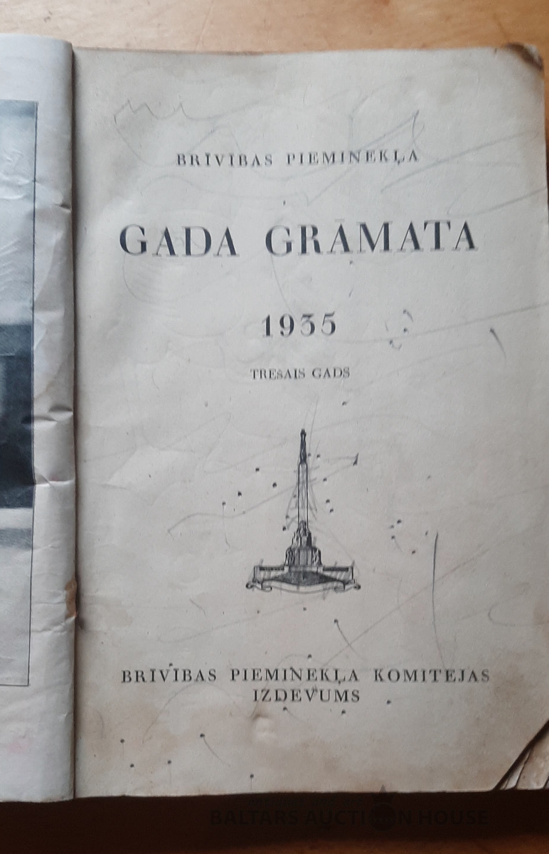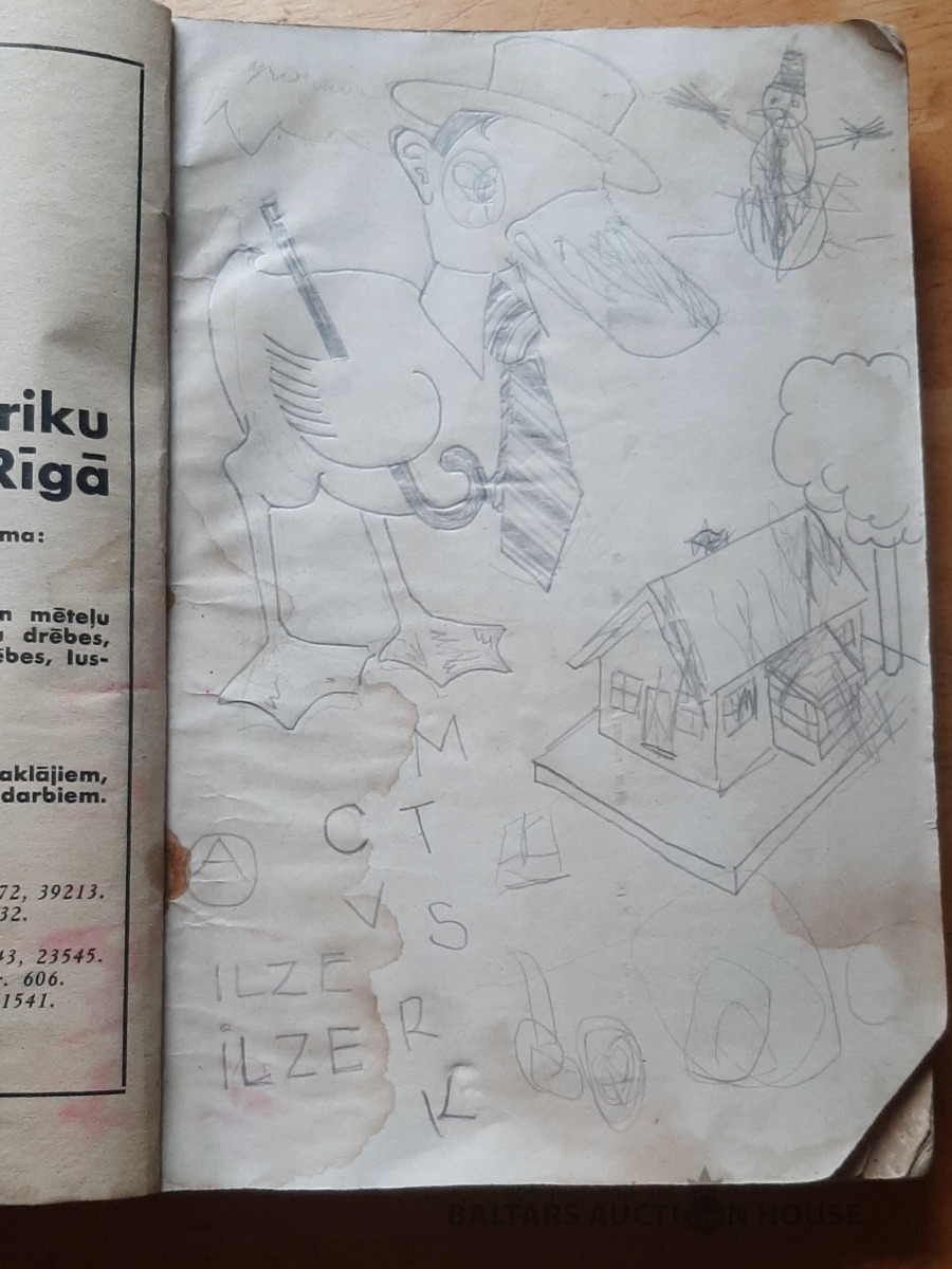 Gada grāmata 1935.gads. Grāmatai nav aizmugurējā vāka, tajā ir daudz ķēpātu lappušu un zīmuļu zīmējumu.