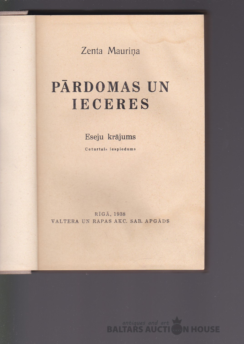 Zenta Mauriņa – Pārdomas un ieceres (eseju krājums), 1938. g. Valters un Rapa. Cietais izdevniecības oriģinālais sējums.