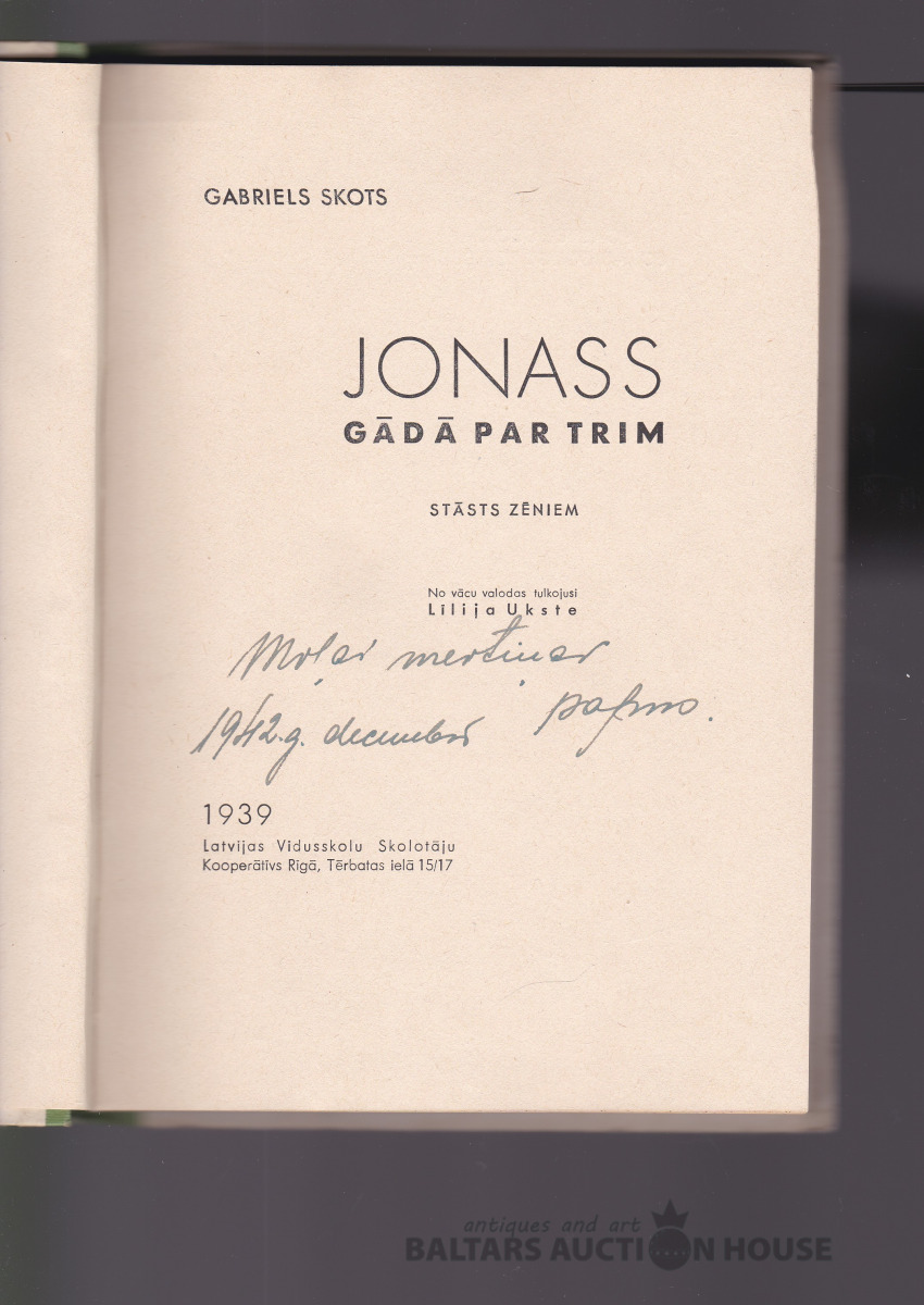 Gabriels Skots –Jonass gādā par trim, 1939. g. Bērnu grāmata. Vāku un daudzās ilustrācijas zīm. Gunars Hermanovskis. Cietais sēj. Latv. vidusskolu skolotāju kooperatīva izd.