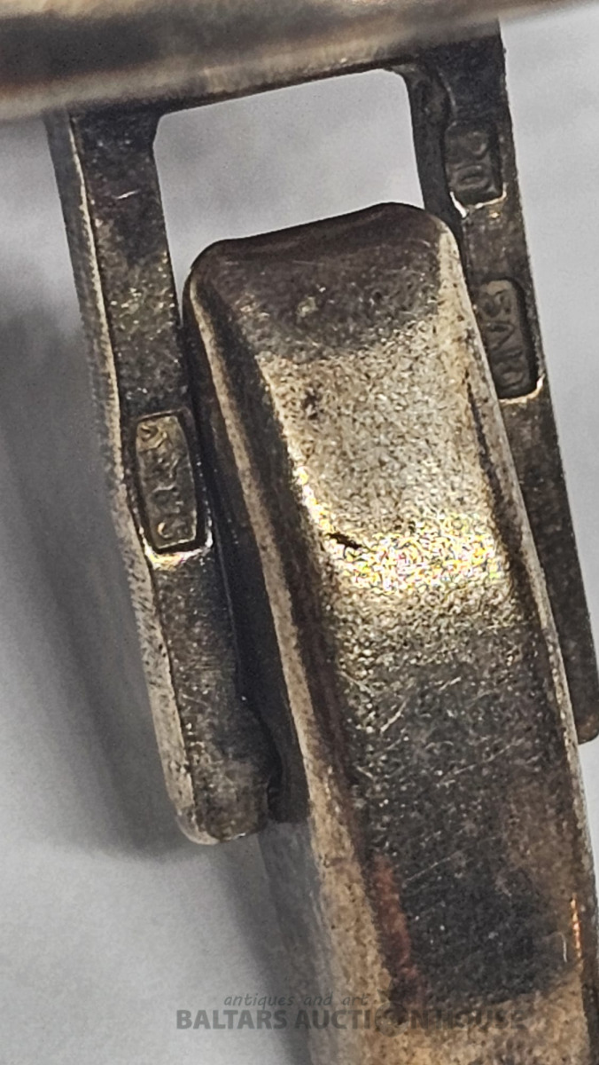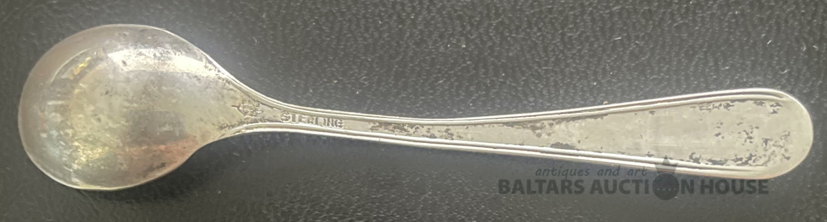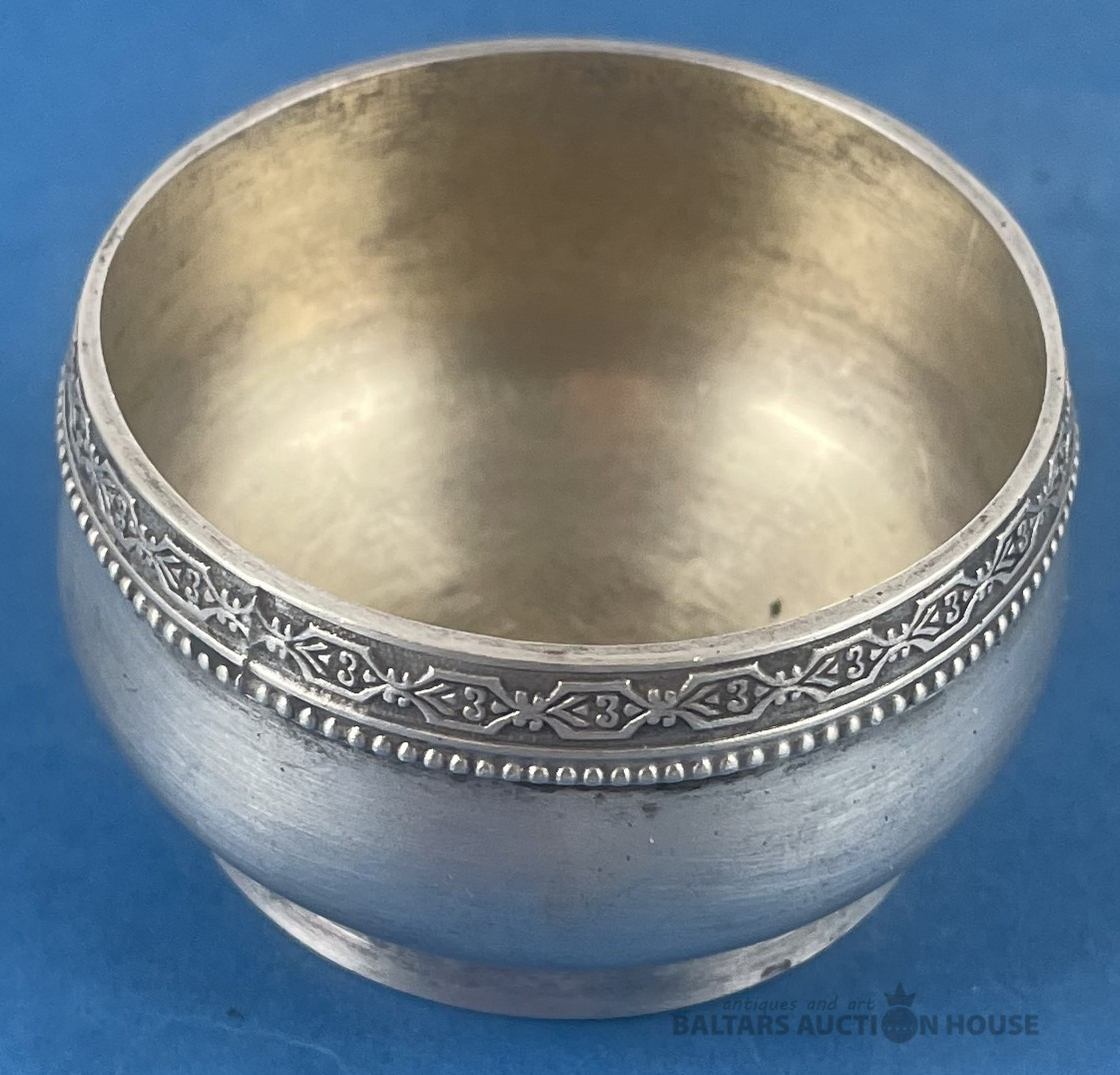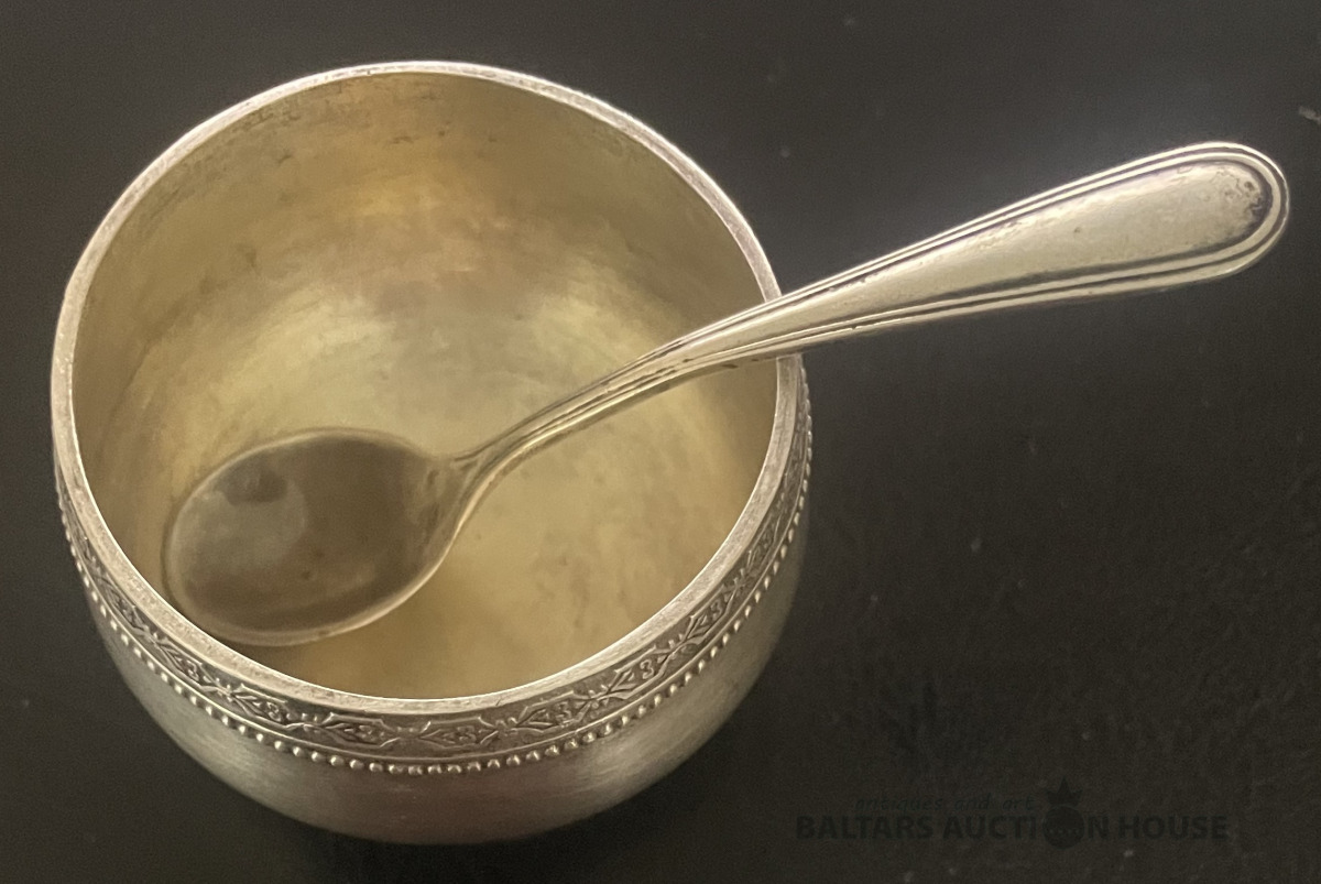 Sāls trauks ar karotīti. Sudrabs 875/sterling. Svars 38,03+6,22 g., kopā=44.25 grami, h=2,6 cm. d=4,7 cm, karotītei l=8,8 cm.