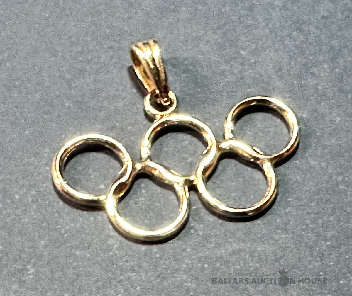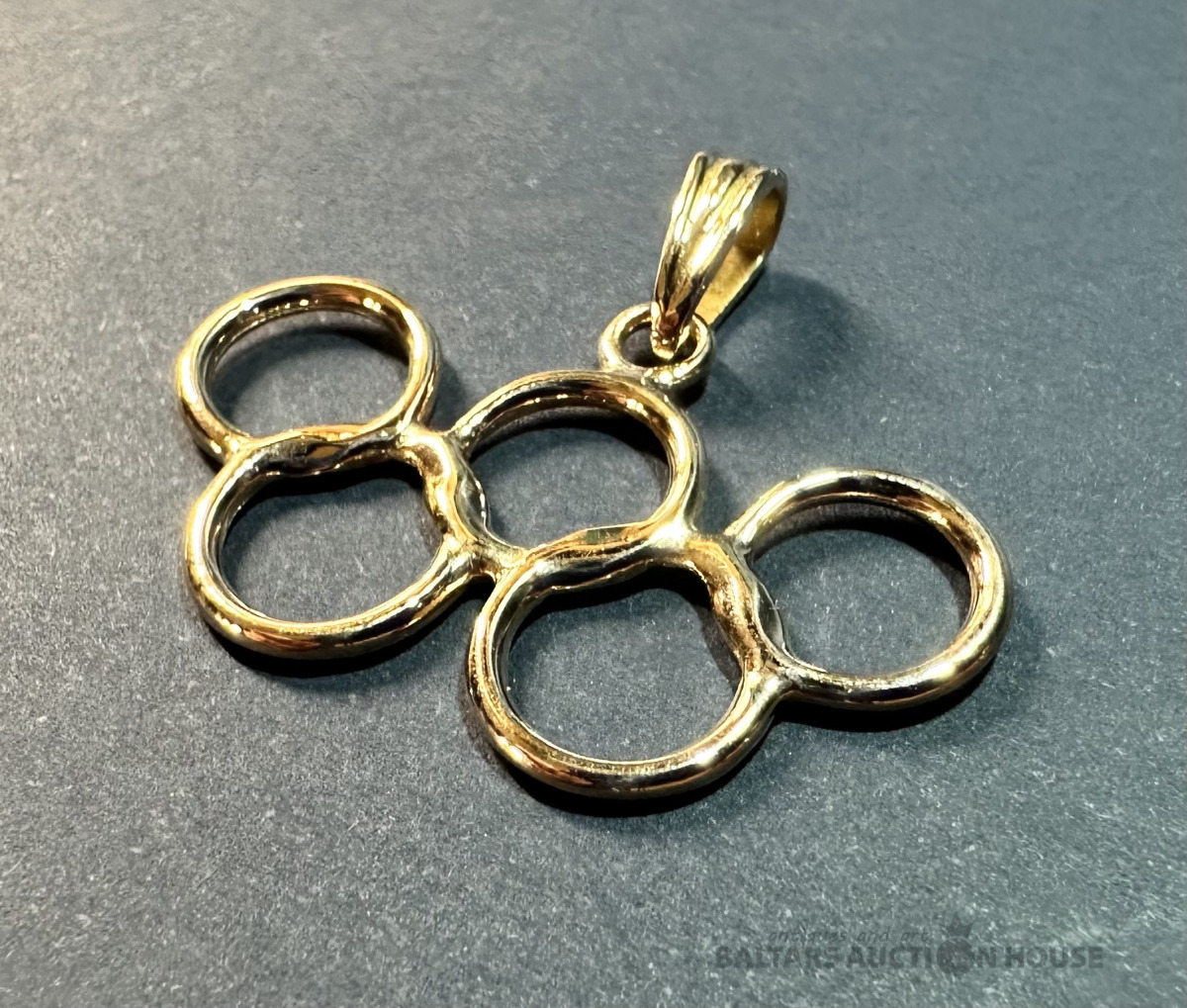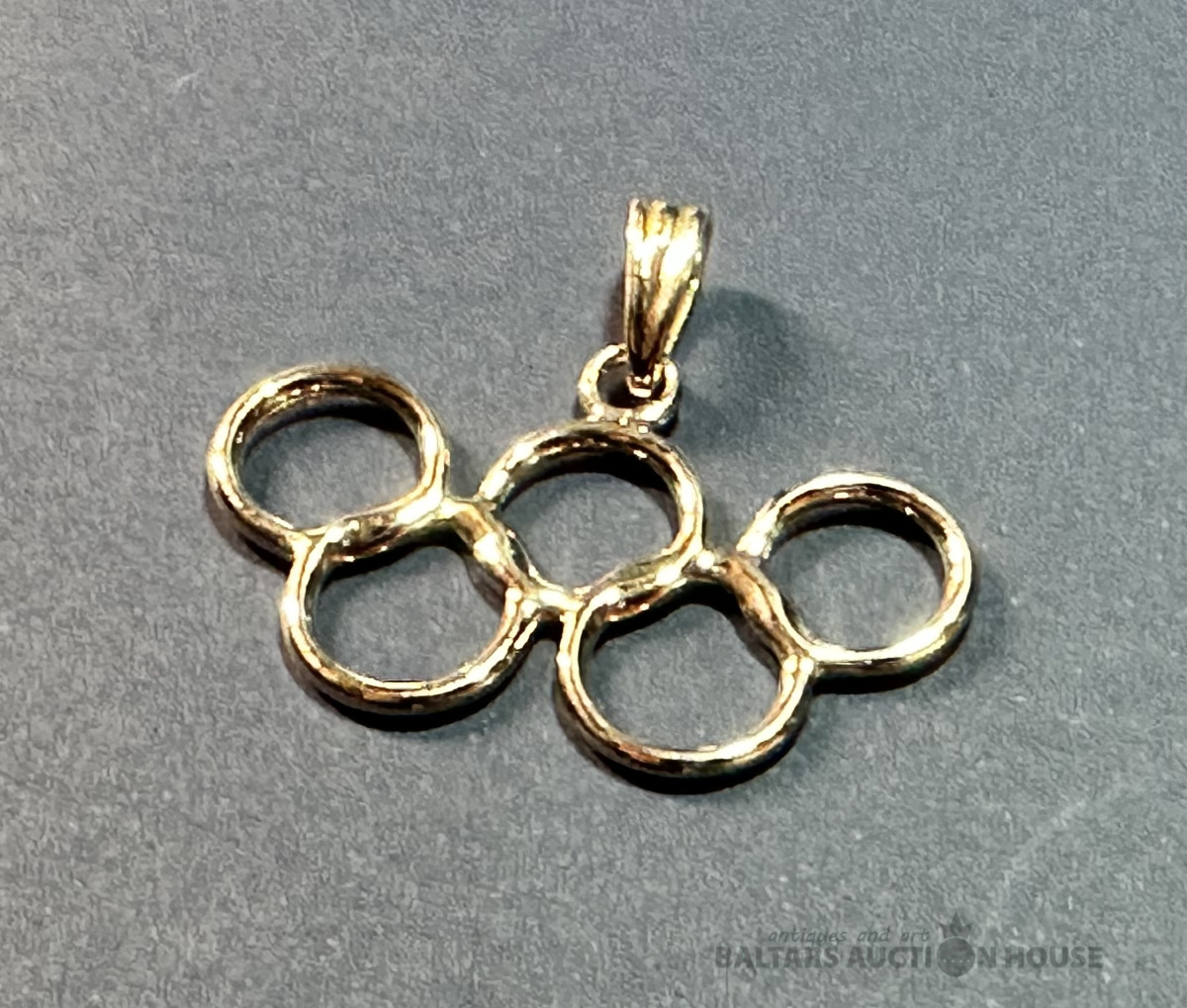 Kulons OLIMPISKIE APĻI, 585, 3.73 grami, viena eksemplāra roku darbs, lielums 30x35 mm, Latvijas proves zīmogs ar Mildu, izgatavots 1990-tie, nevalkāts.