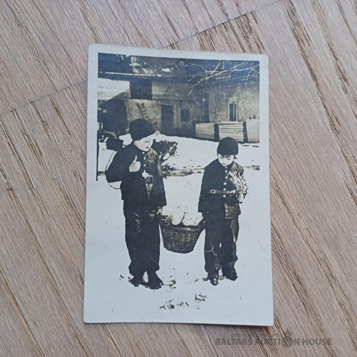 Foto: Bērni ar sivēniem 1943. g. ziemā. Otrā pusē apsveikums Jaunajā gadā.