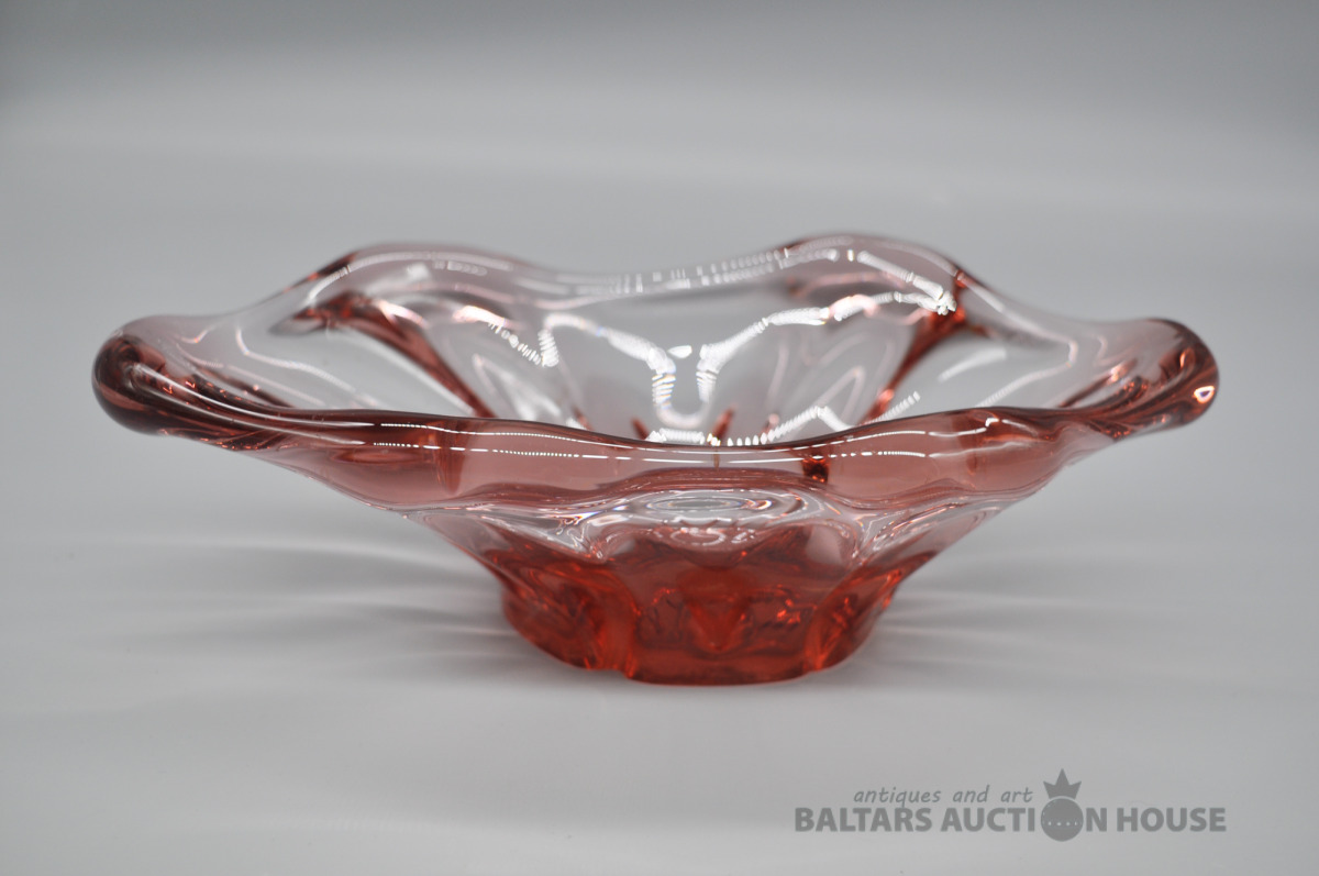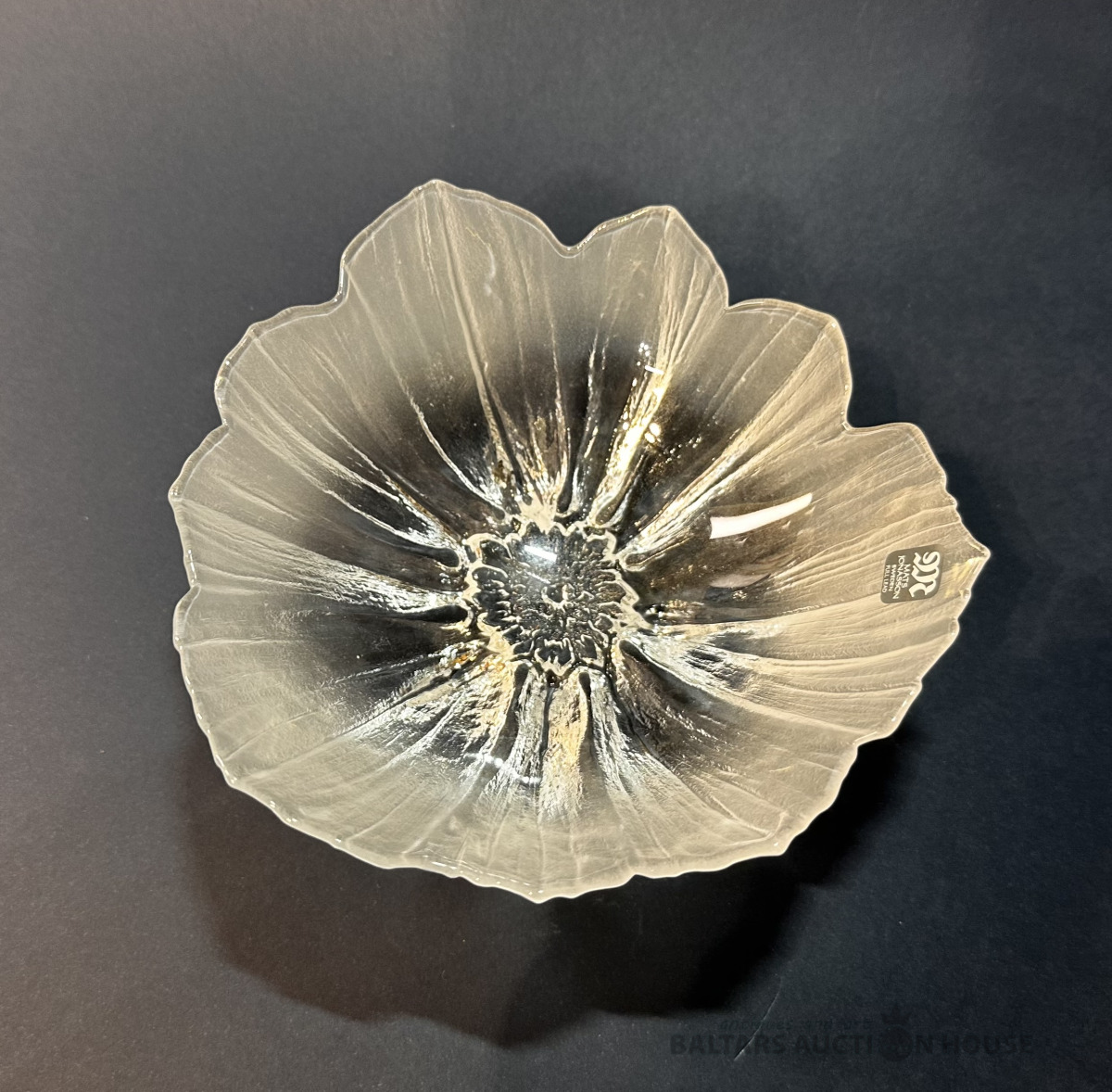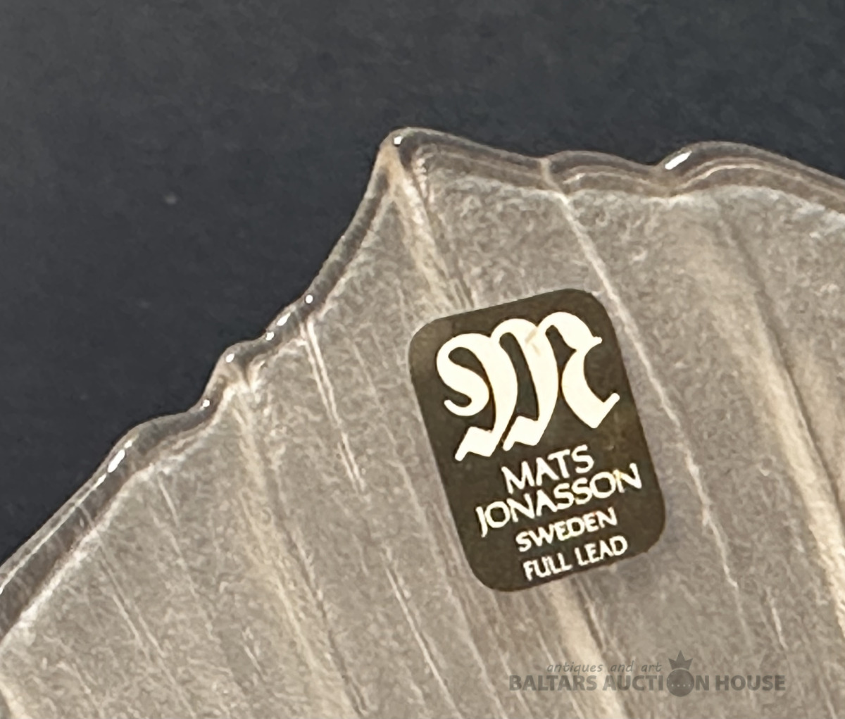 Kristāla saldumu trauks, Dizaina priekšmets no zviedru zīmola Mats Jonasson, uzplaukuša zieda forma, vidus dzidrs, uz malām pakāpeniski pāriet uz matētu, dimetrs 15 cm. Pēdējais foto no interneta.