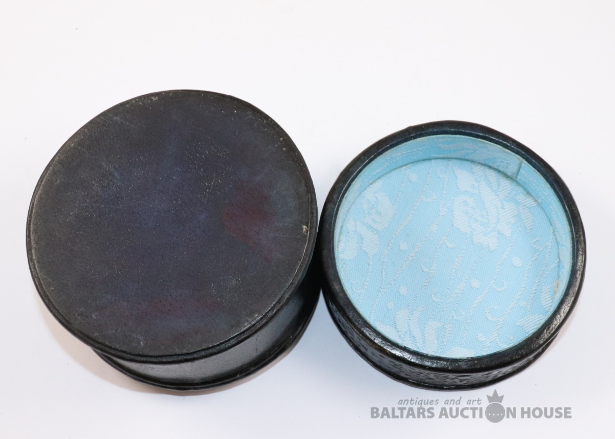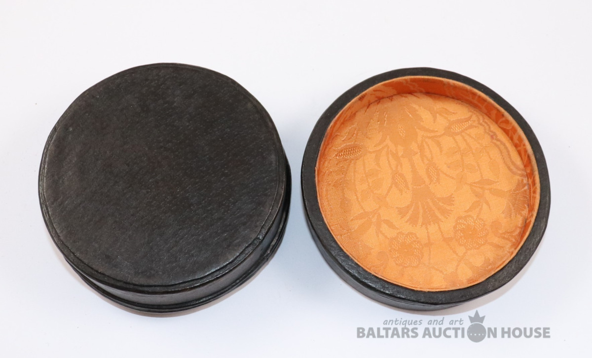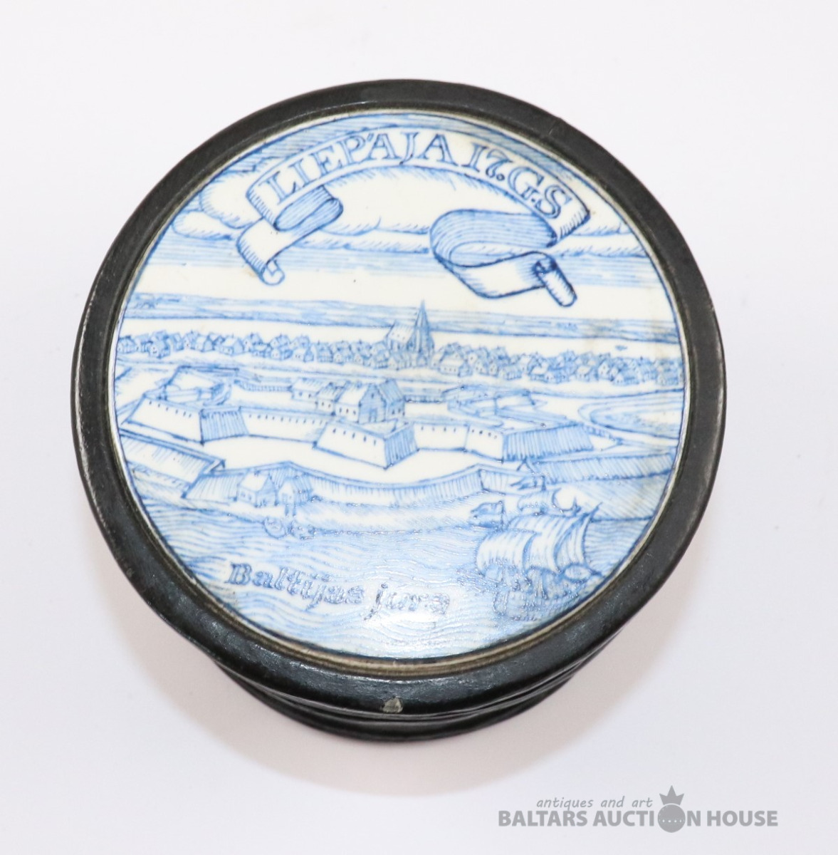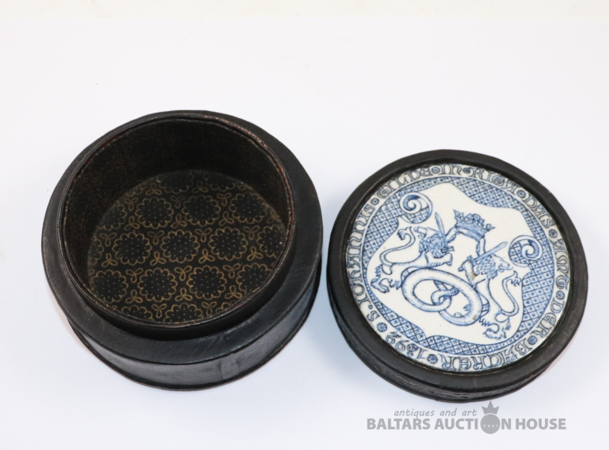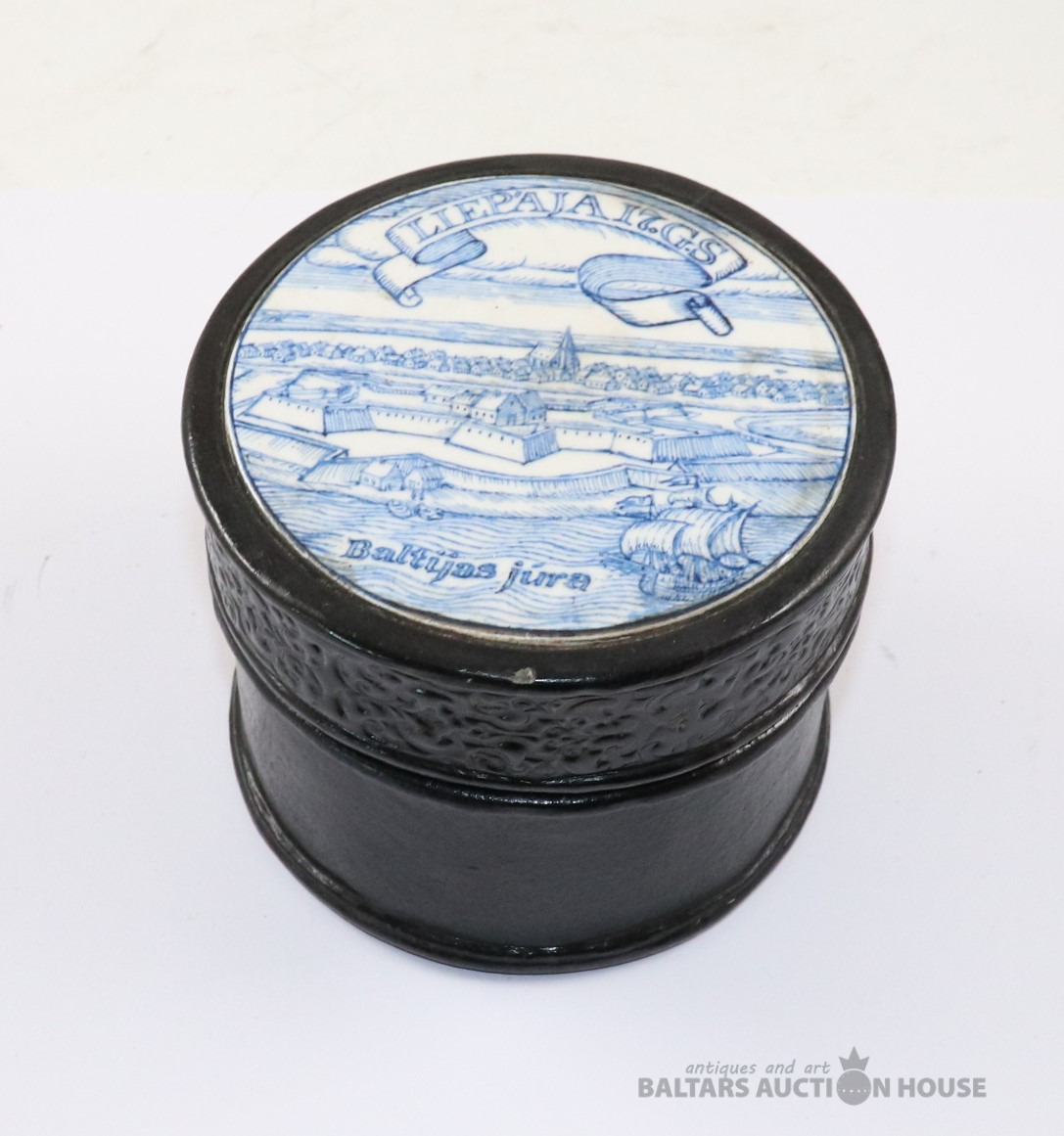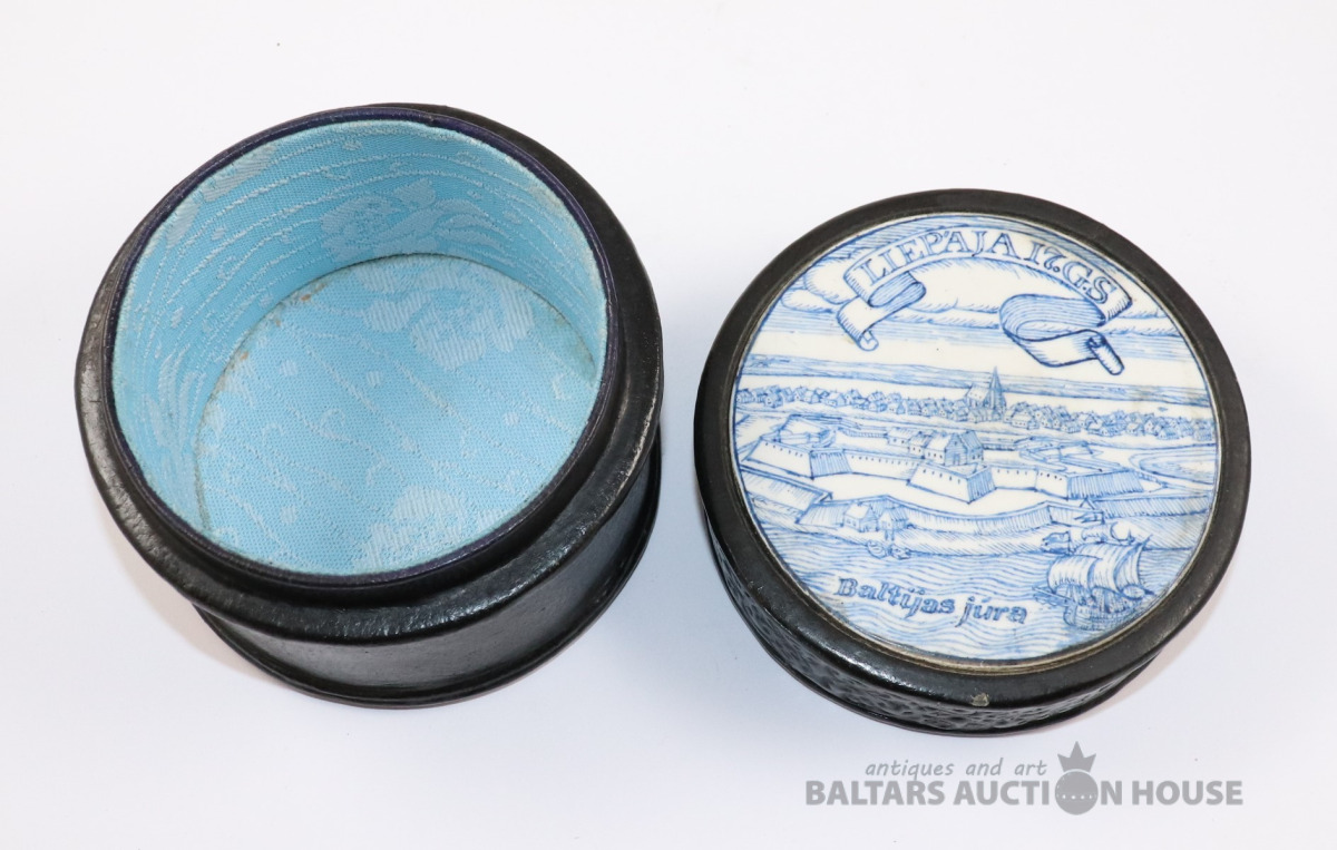 Lādīte ar vāku LIEPĀJA 17. gs. Autors Ēriks Priedkalns, roku gleznojums, āda, porcelāns. h=10,4 cm. d=13 cm