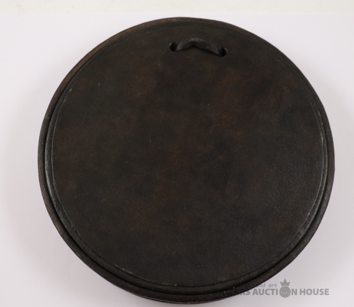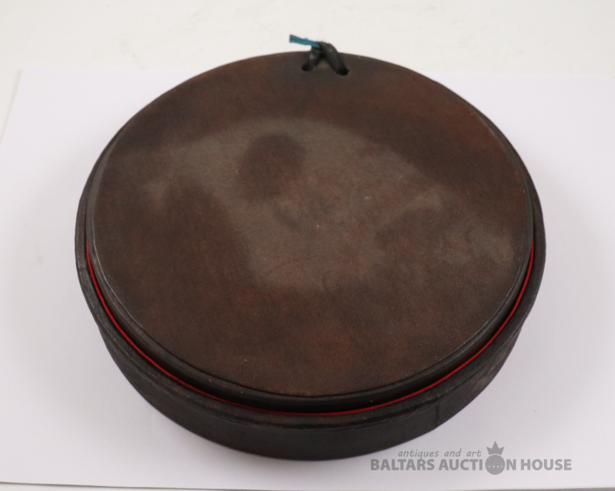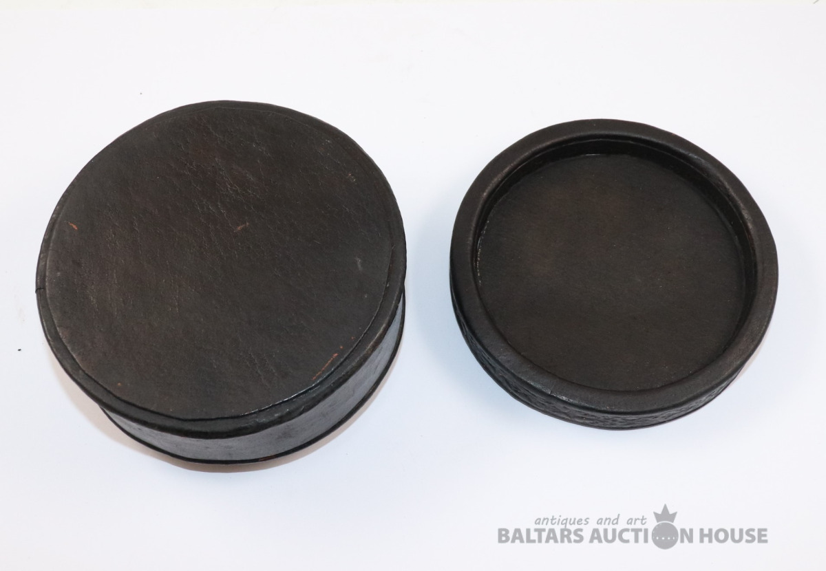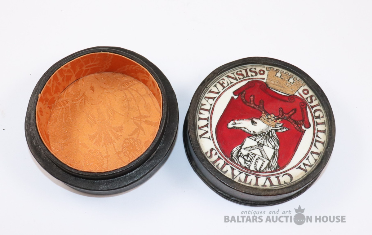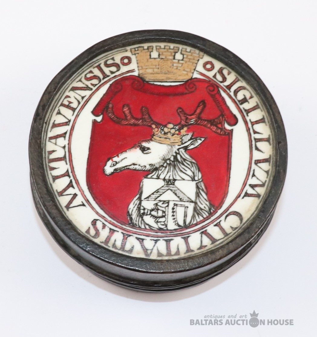 Lādīte ar vāku SIGILLUM CIVITATIS MITAUENSIS. Autors Ēriks Priedkalns, roku gleznojums, āda, porcelāns. h=6,4 cm. d=12,3 cm