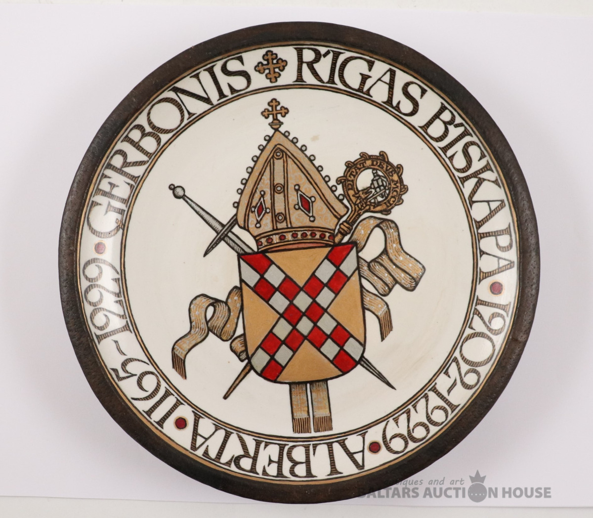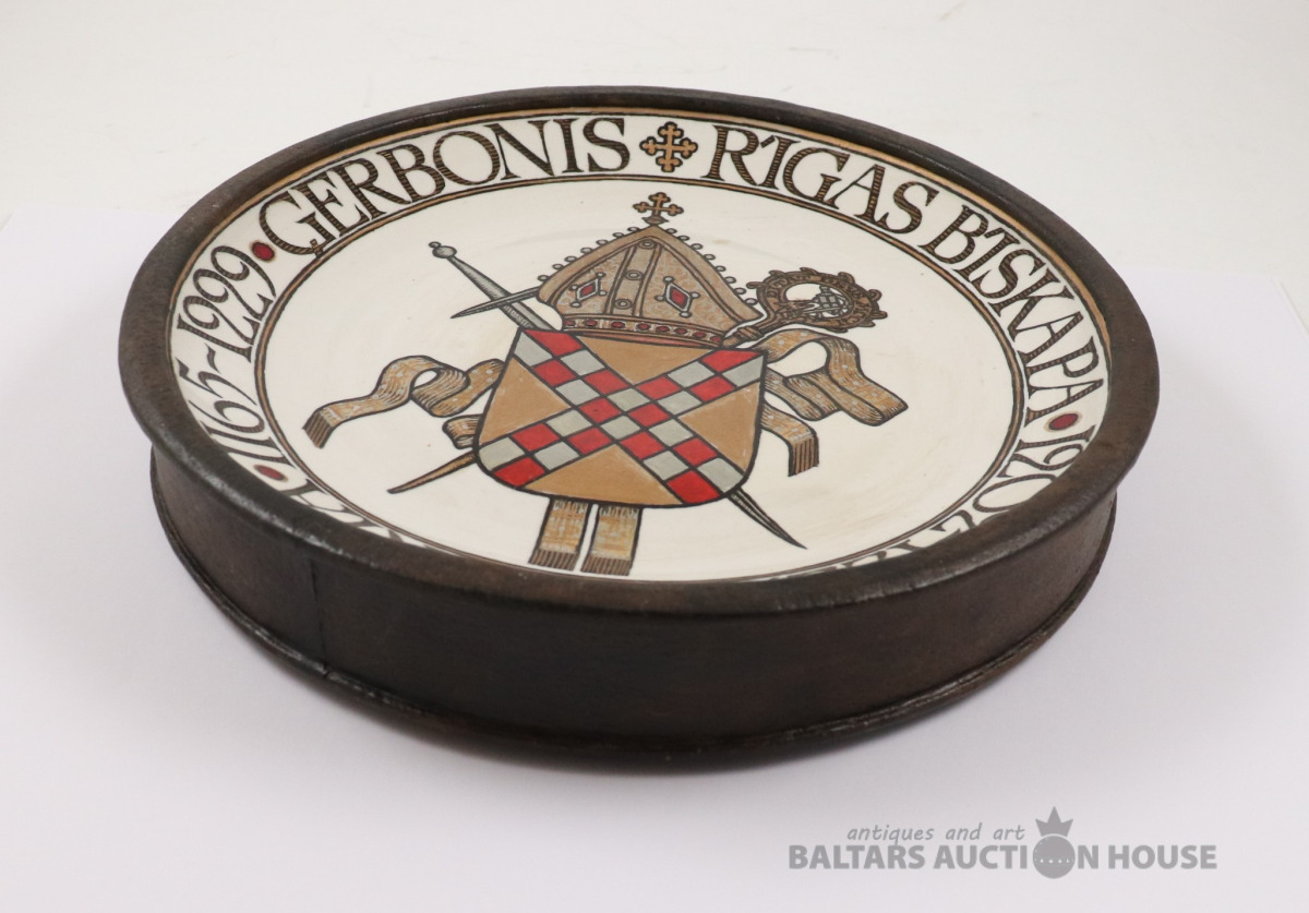 Sienas šķīvis RĪGAS BĪSKAPA ĢERBONIS. Autors Ēriks Priedkalns, roku gleznojums, āda, porcelāns. h=4,5 cm, d=25,7 cm