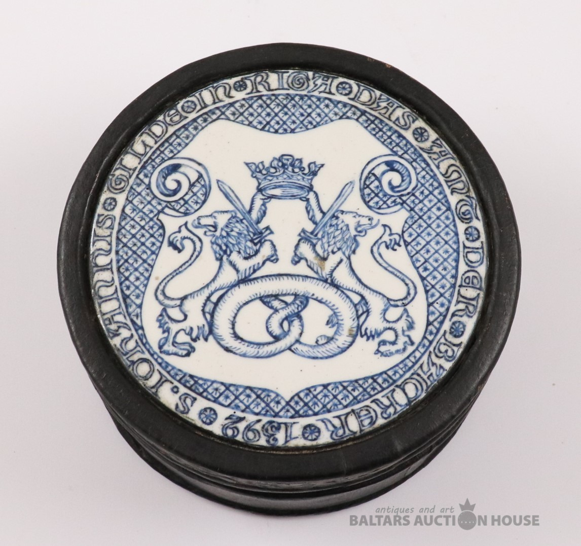 Lādīte ar vāku GILDE IN RIGA. Autors Ēriks Priedkalns, roku gleznojums, āda, porcelāns. h=7 cm. d=13,2 cm
