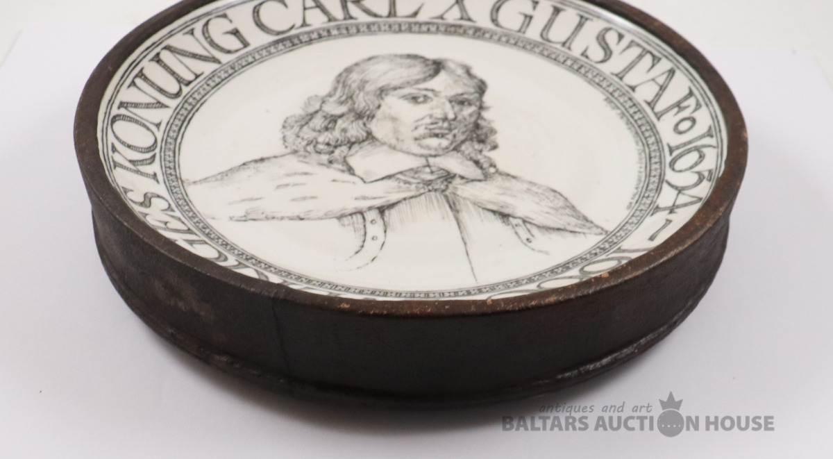 Sienas šķīvis CARL X GUSTAF. Autors Ēriks Priedkalns, roku gleznojums, āda, porcelāns. h=4,5 cm. d=25 cm