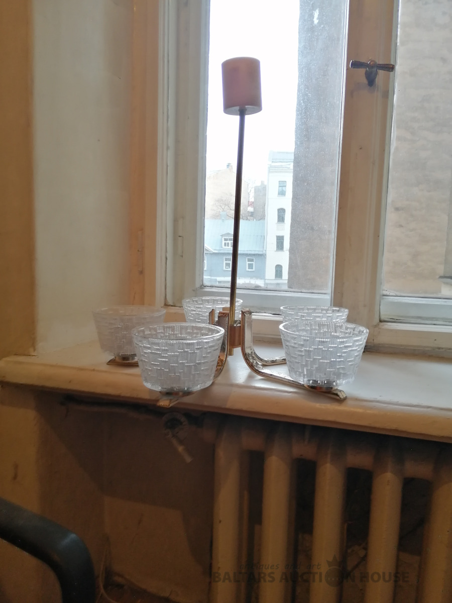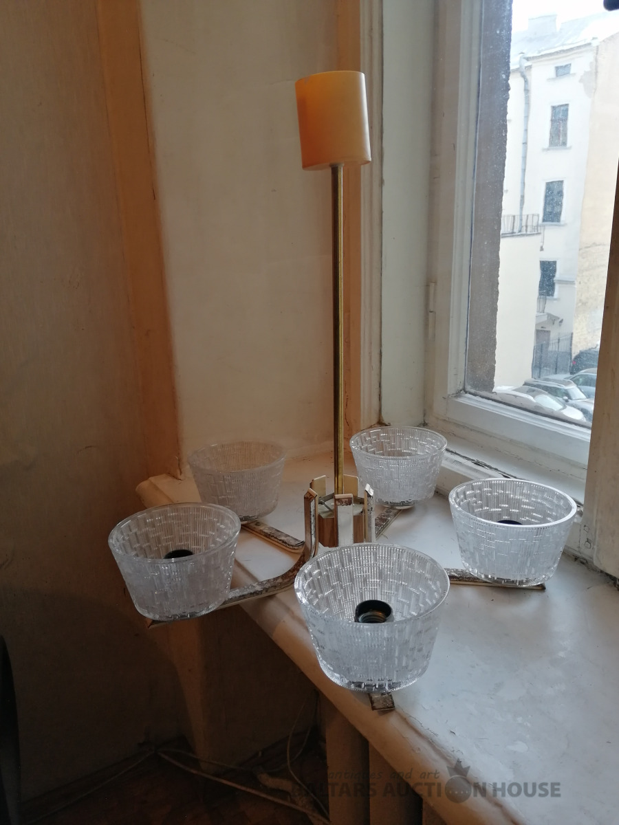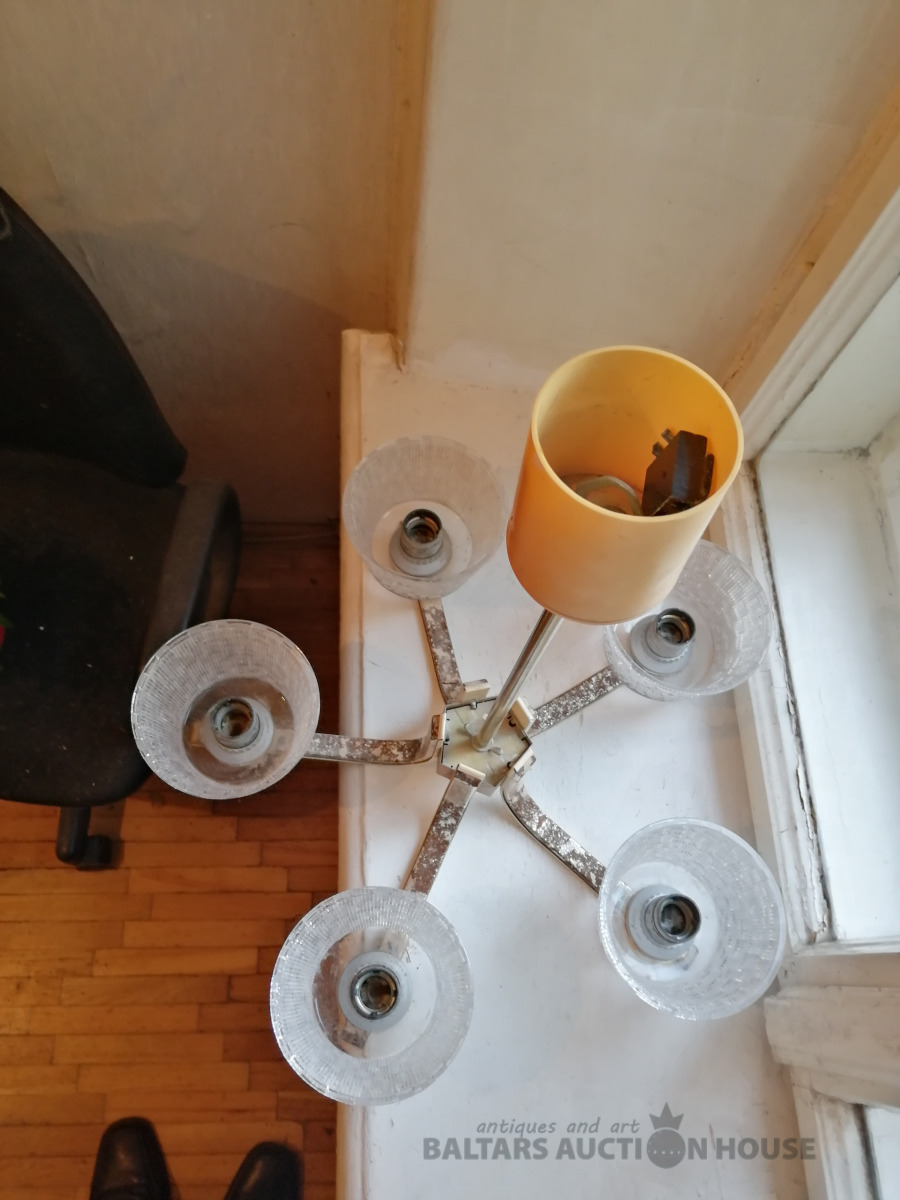 5-žuburu lustra ar stikla kupoliem. Visi kupoli veseli, kupolus turošajiem zariem augšpusē hromējums padilis, no apakšas to neredz