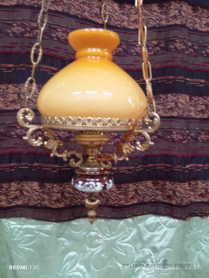 Skaista retro griestu lampa ar petrolejas stila dizainu, izgatavota no stikla un misiņa, ar ķēdes piekari., Skaista retro griestu lampa ar petrolejas stila dizainu, ar ķēdes piekari.