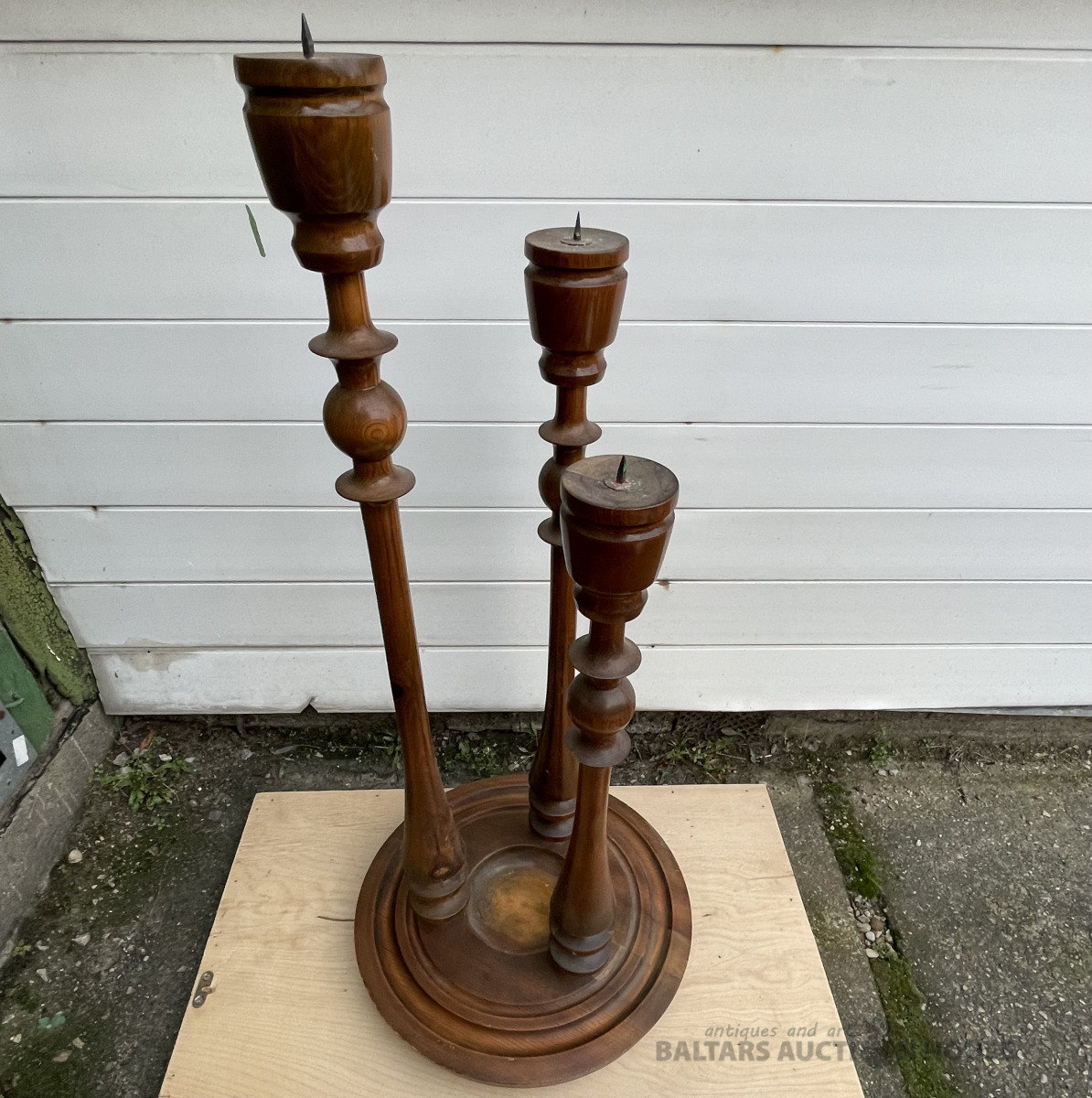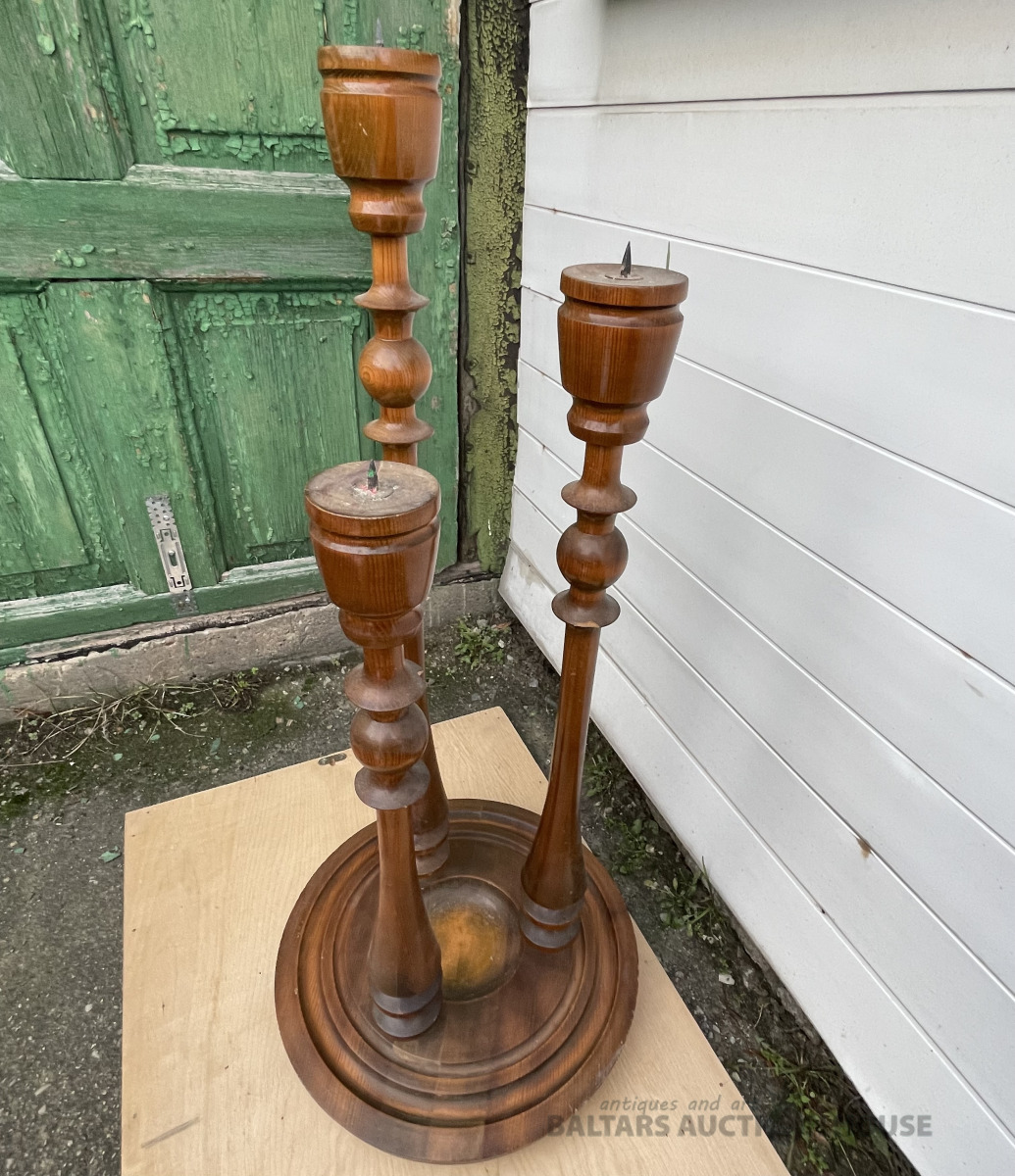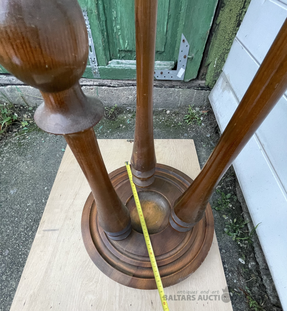 Koka svečturis priekš 3 lielām svecēm. H- 80,5 cm, d- 37,5 cm. Ir sīki defekti- 2 nošķēlumi, skatīt foto nr.6.