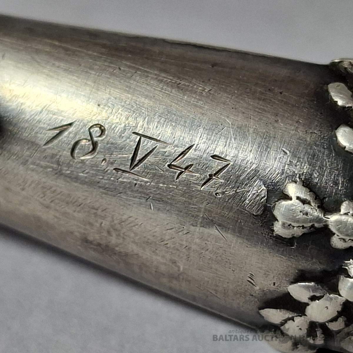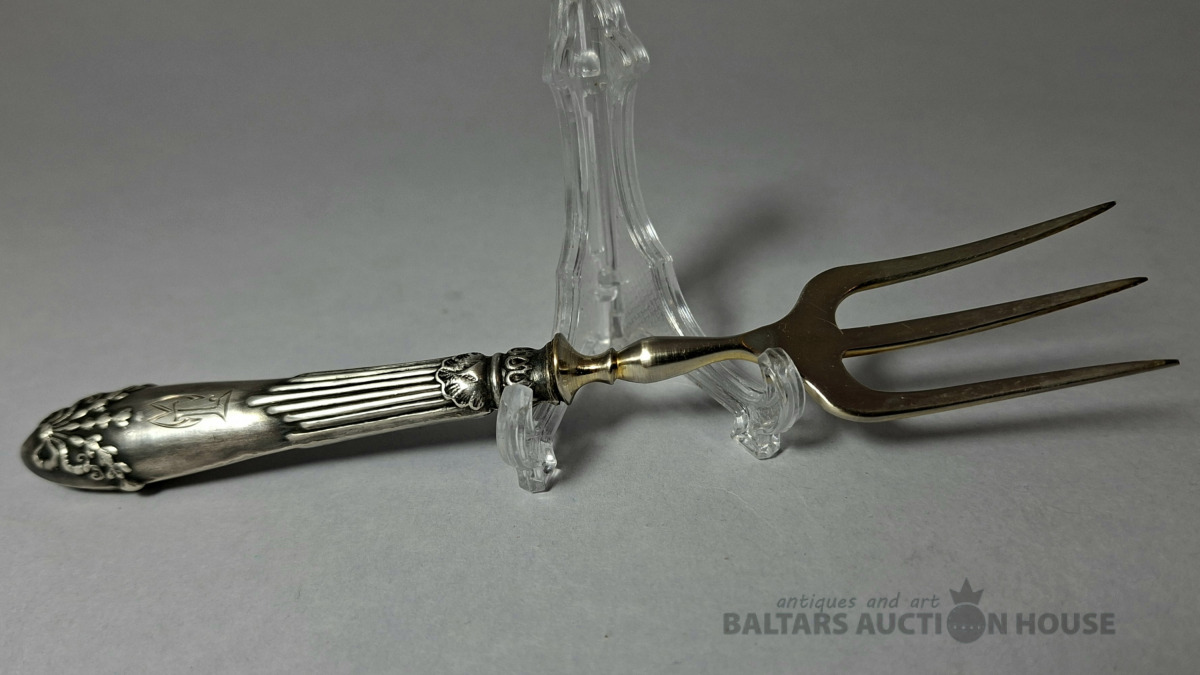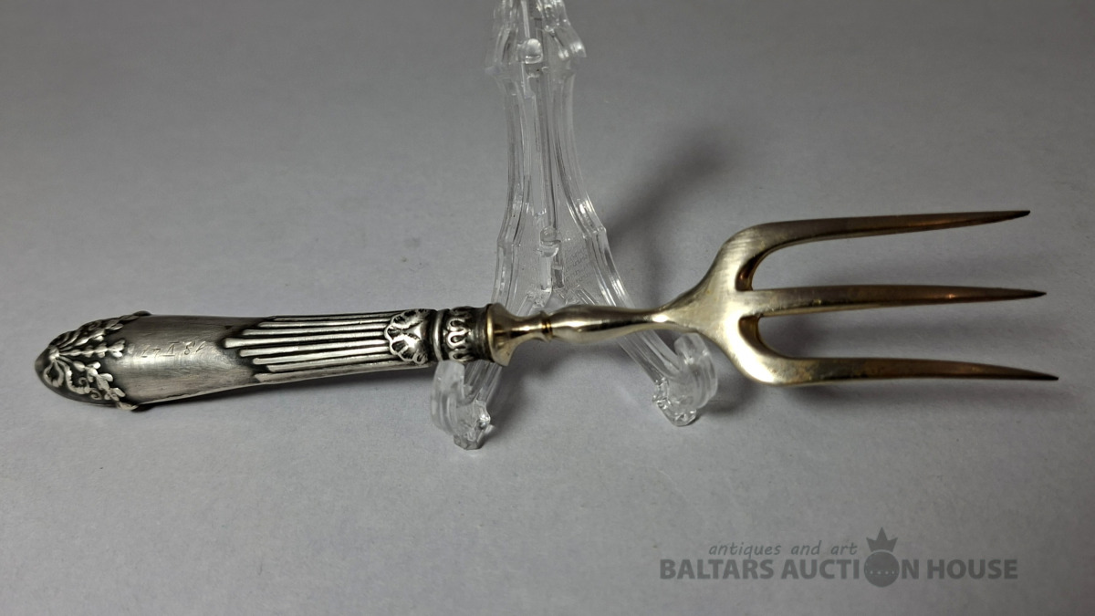 Sardīņu (zivju) dakšiņa. Sudrabs? Nav proves. Apzeltījums ir nodilis. Garums 16 cm. Kopējais svars 32 grami.