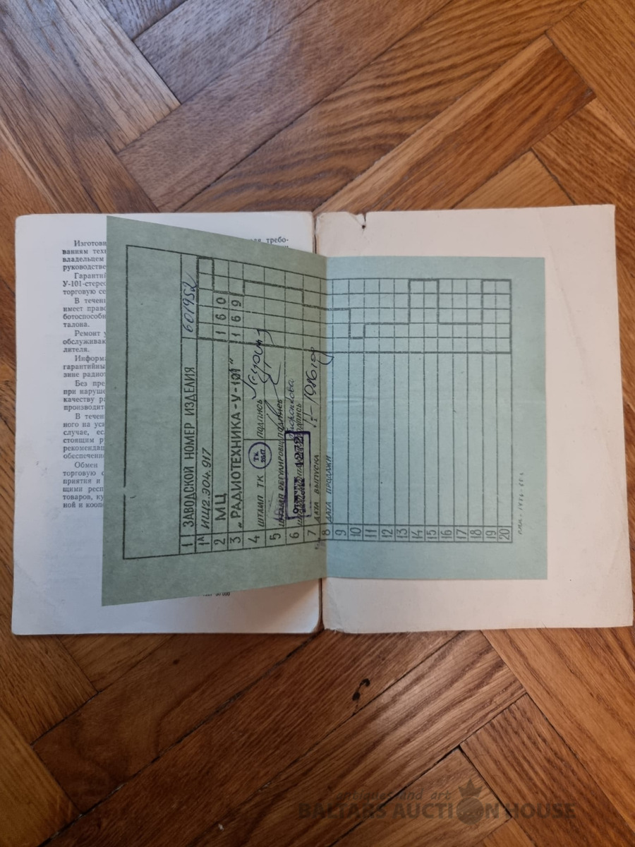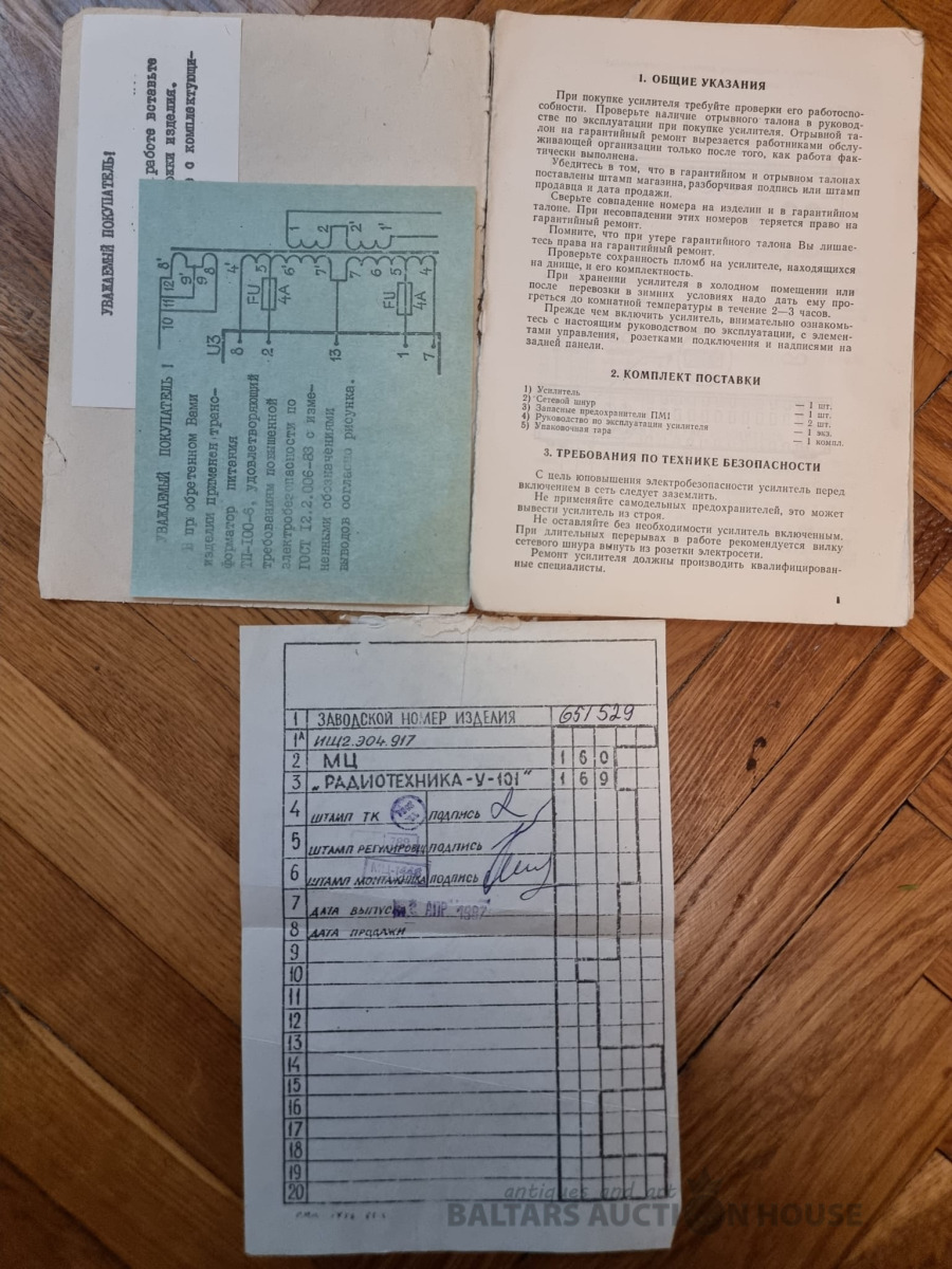 Radiotehnika Patiprinātāja Y-101 instrukcija un garantyijas taloni.