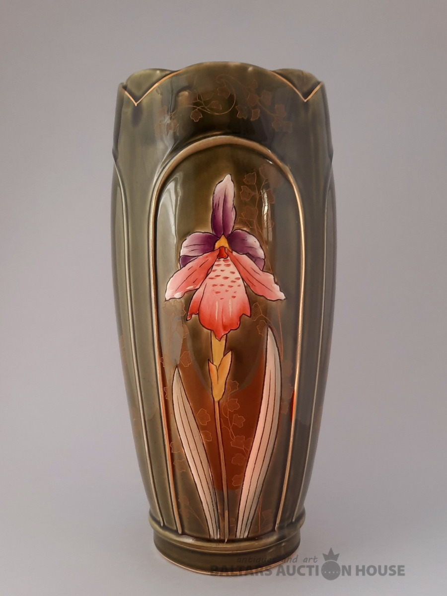 Skaista vāze, ko radījis Antuāns Bruns, Five-Lille. Šī vāze ir dekorēta ar emaljētiem īrisiem, kas ir kvalitatīvs roku darbs, kas ir tipisks šim periodam. Vāze ir ideālā stāvoklī un ir 28 cm augsta. Keramika. Ražota Francijā.