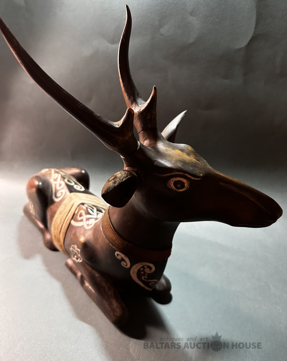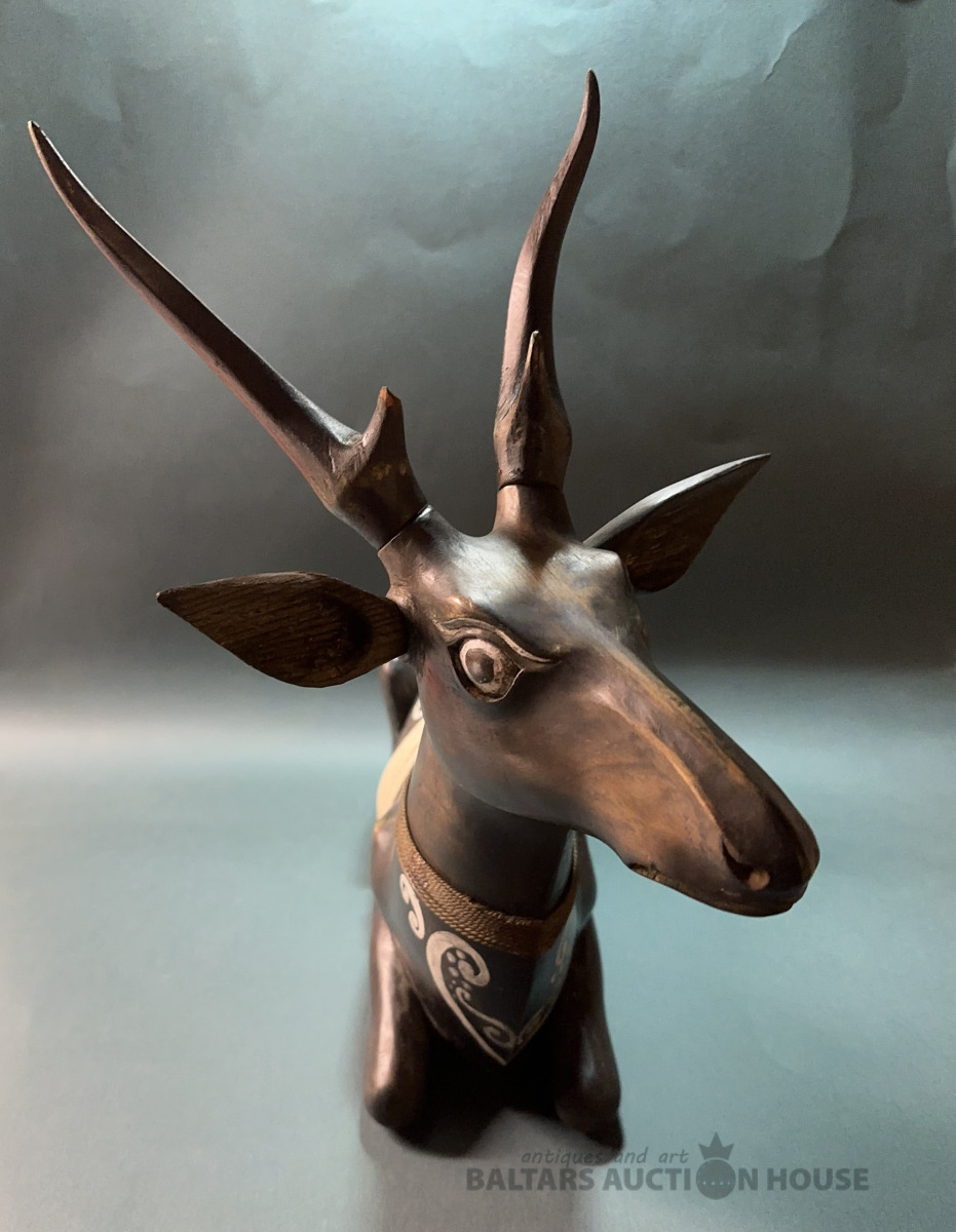 Sena koka skulptūra BRIEDĪTIS, roku darbs, lielums 46x15x38 cm, tumšs koks neidentificēts Āfrika?, lietojuma pazīmes, viena auss mainīta.