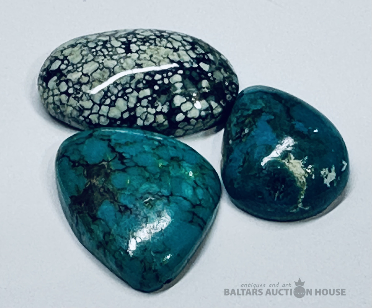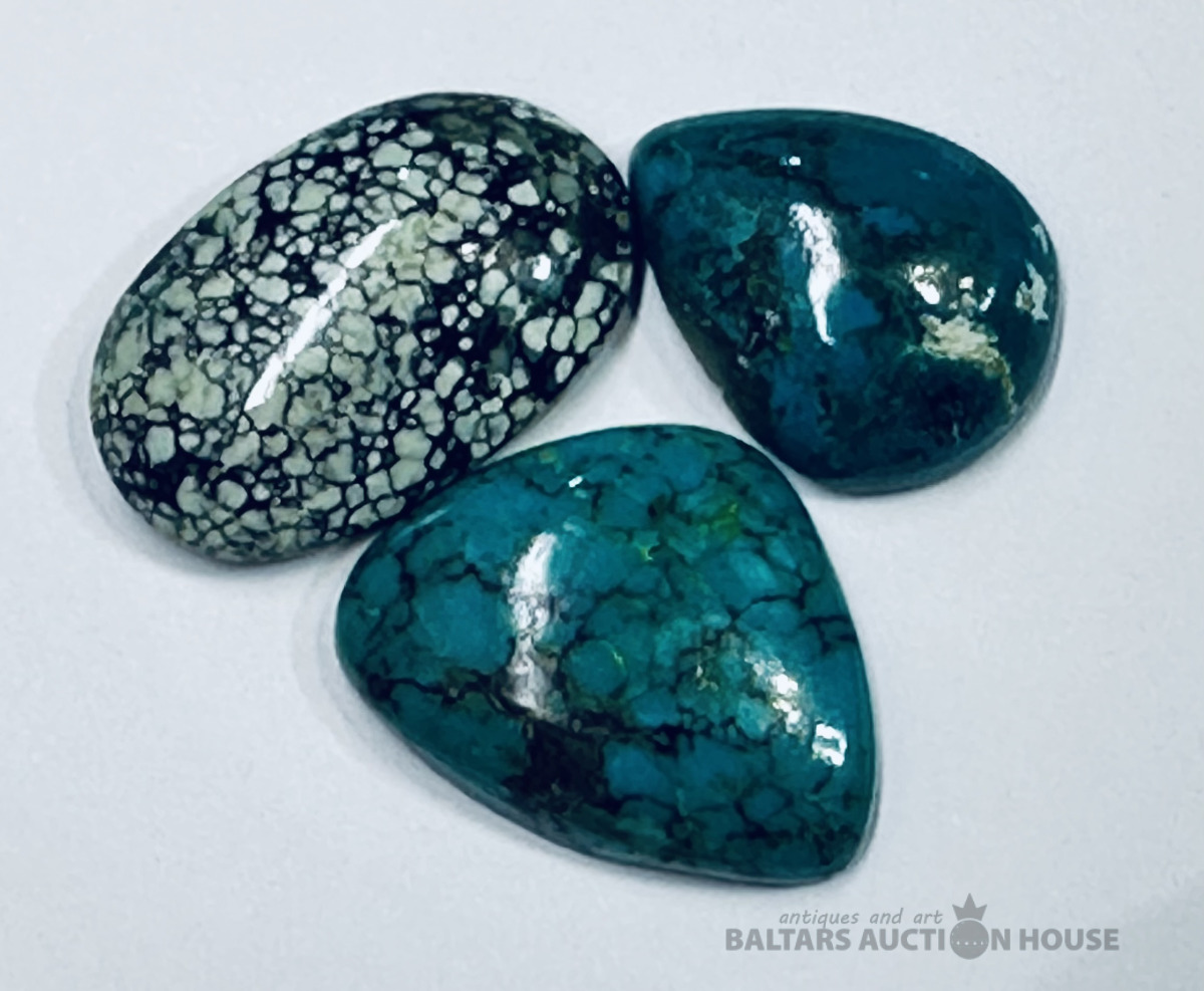 Tirkīzs, 3 gb, dabīgs, stabilizēts, kabošona slīpējums, svars: 24 karāti, 17 karāti un 15 karāti lāsīte, izmēri: 27x17 mm ovālais, 26x20 mm trijst., un 22x16 mm lāsīte, bez sertifikātiem , iegādāts no Polijas juvelieru rūpnīcas.