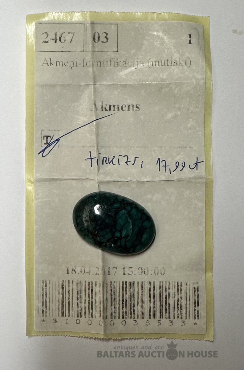 Tirkīzs, dabīgs, stabilizēts, kabošona slīpējums, svars 17,99 karāti, lielums 25x17 mm, pārbaudīts Latvijas Proves birojā, identifikācijas izziņas Nr. 2467-03, iegādāts no Polijas juvelieru rūpnīcas.