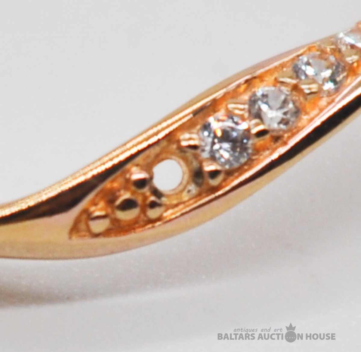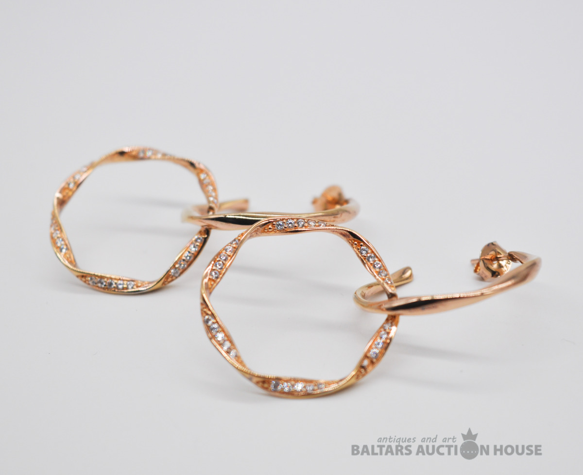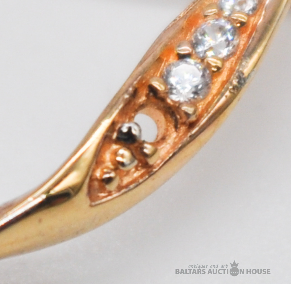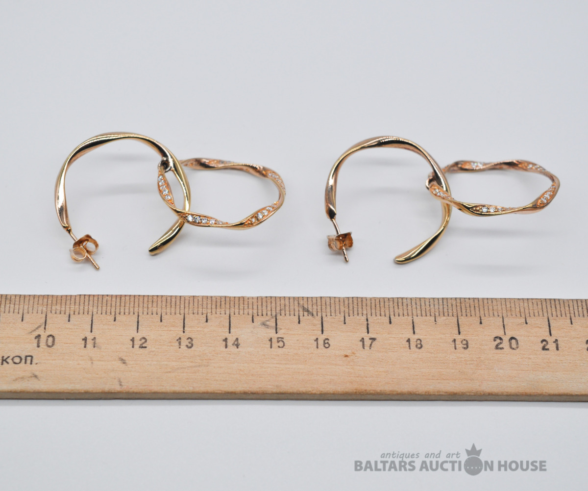 Grezni, apzeltīta sudraba auskari. Katrā auskarā nozaudēts viens cirkonija kristāliņš. Garums 55 mm. Svars 11.3 grami.