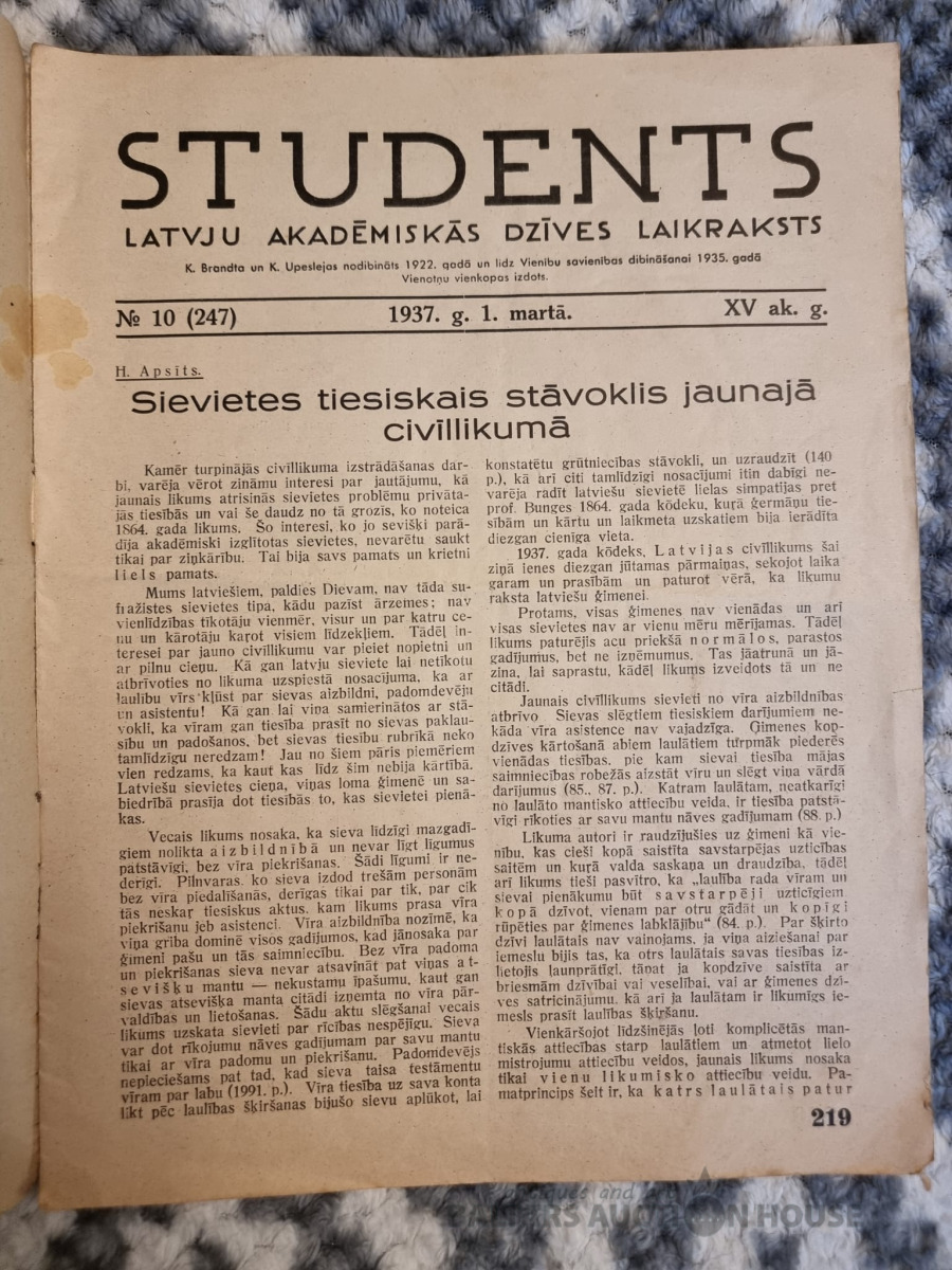 Latvju akadēmiskās dzīves laikraksts "Students", 1937. gada 1. marta numurs, Nr. 10
