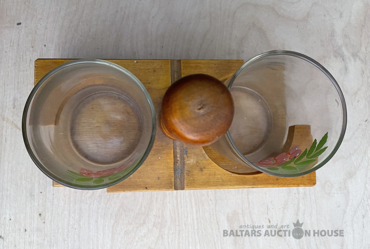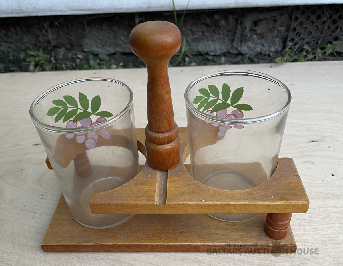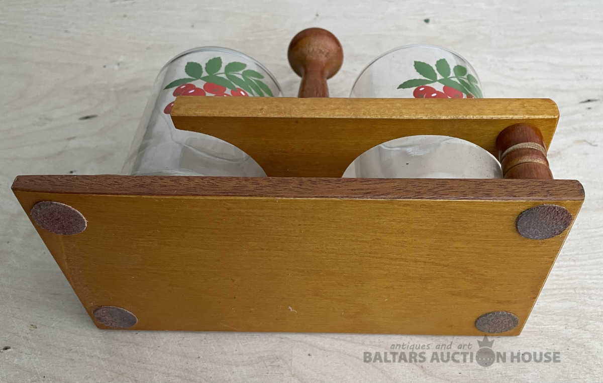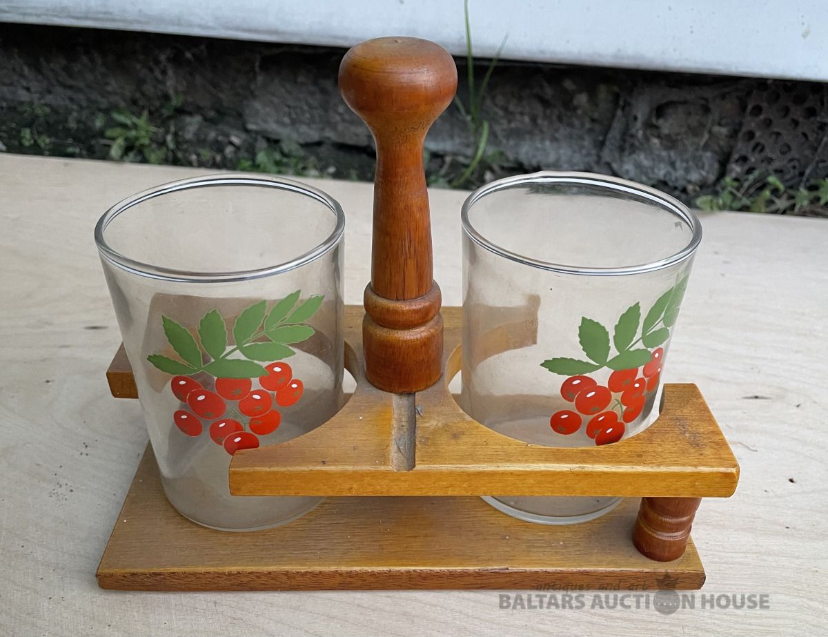 Koka turētājs ar 2 stikla glāzēm ar pīlādžiem. Bez traumām