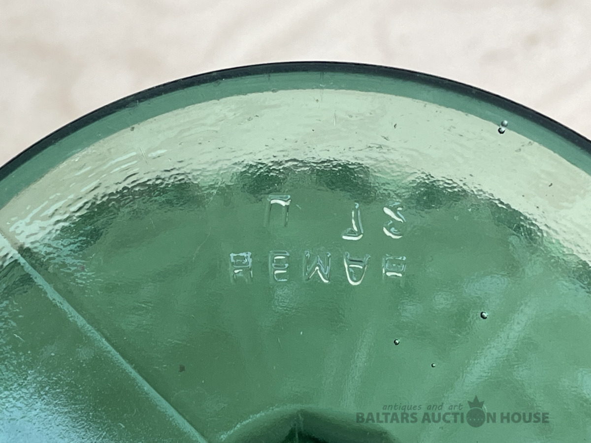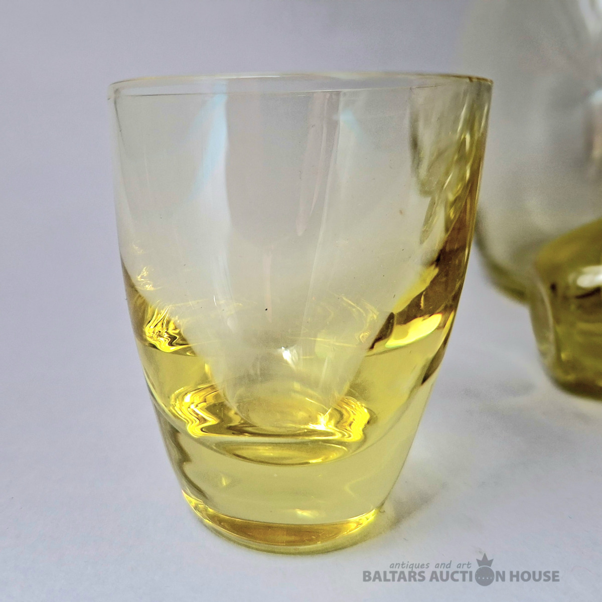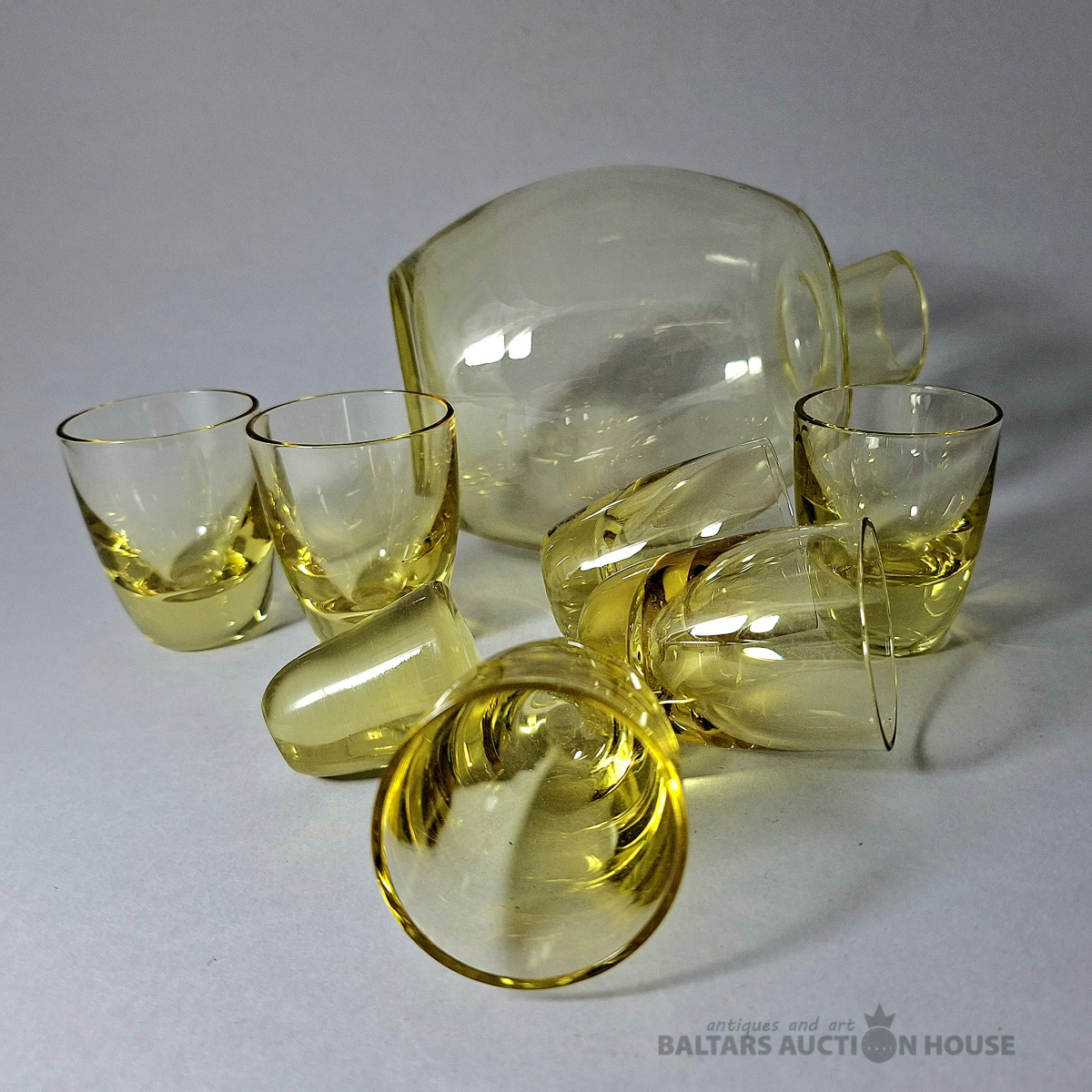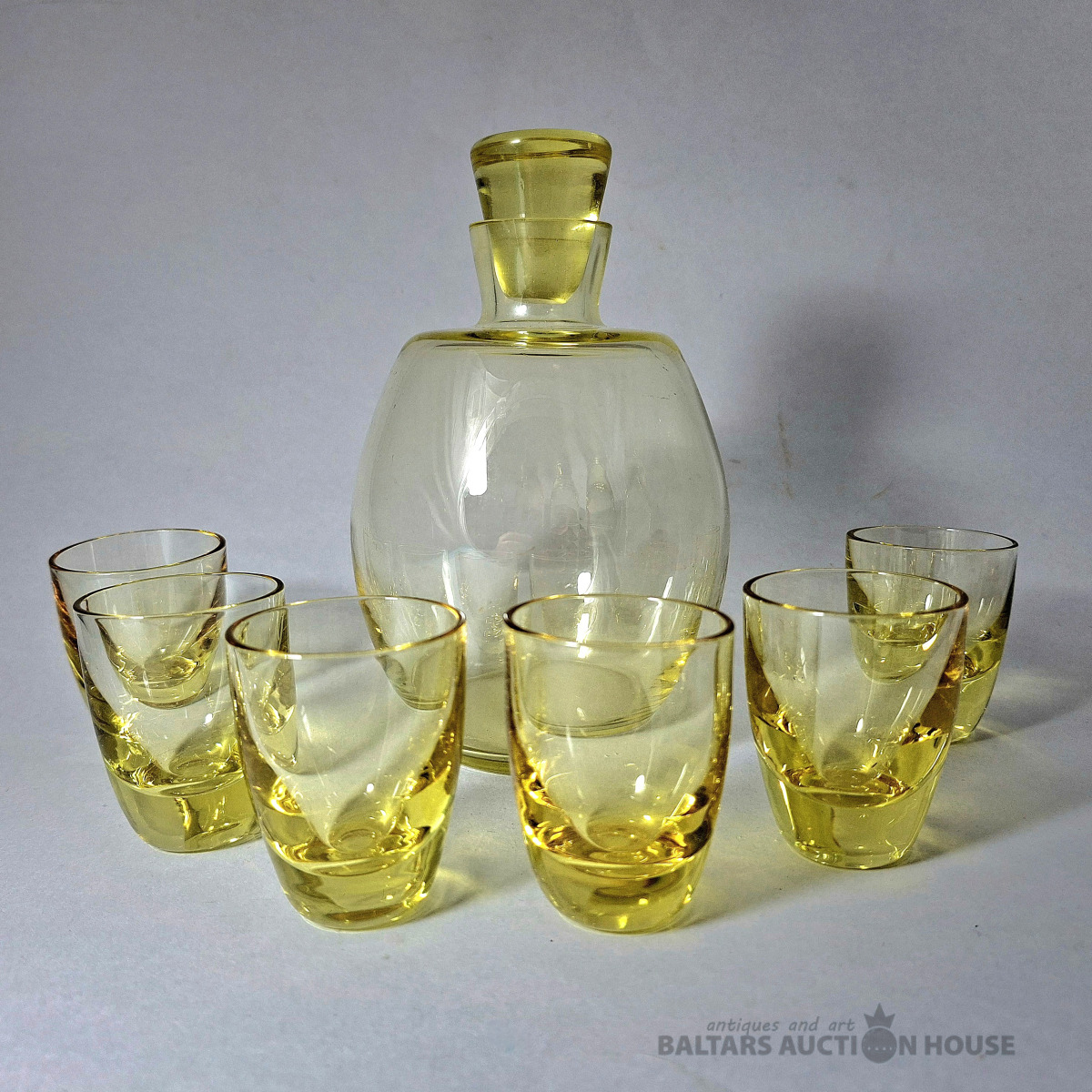 Komplekts, kas sastāv no dekantera un sešām citronkrāsas šotu glāzēm, izgatavotas no krāsaina stikla. Dekantera augstums ir 16 cm. Šotu glāzes augstums ir 3,5 cm.