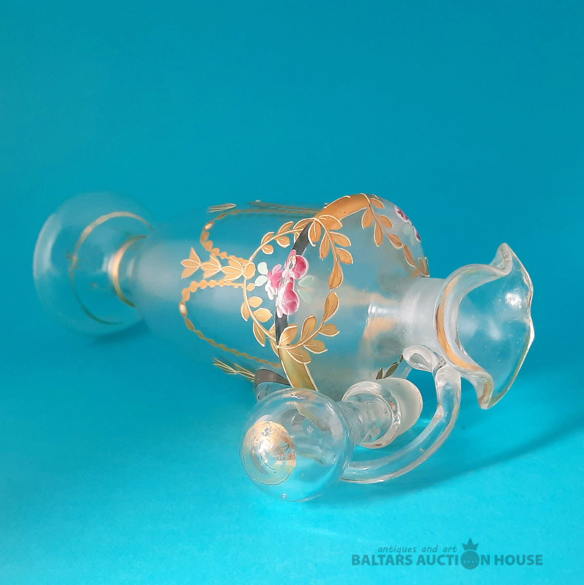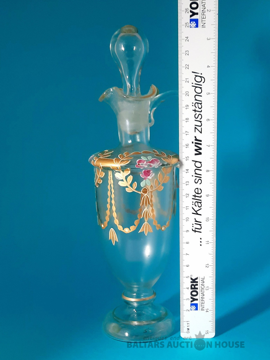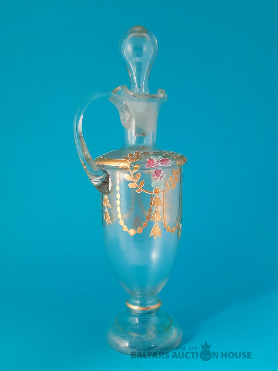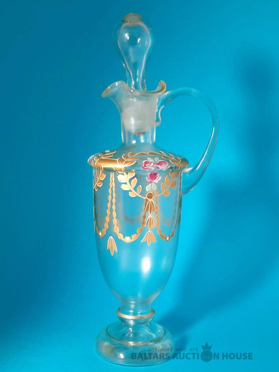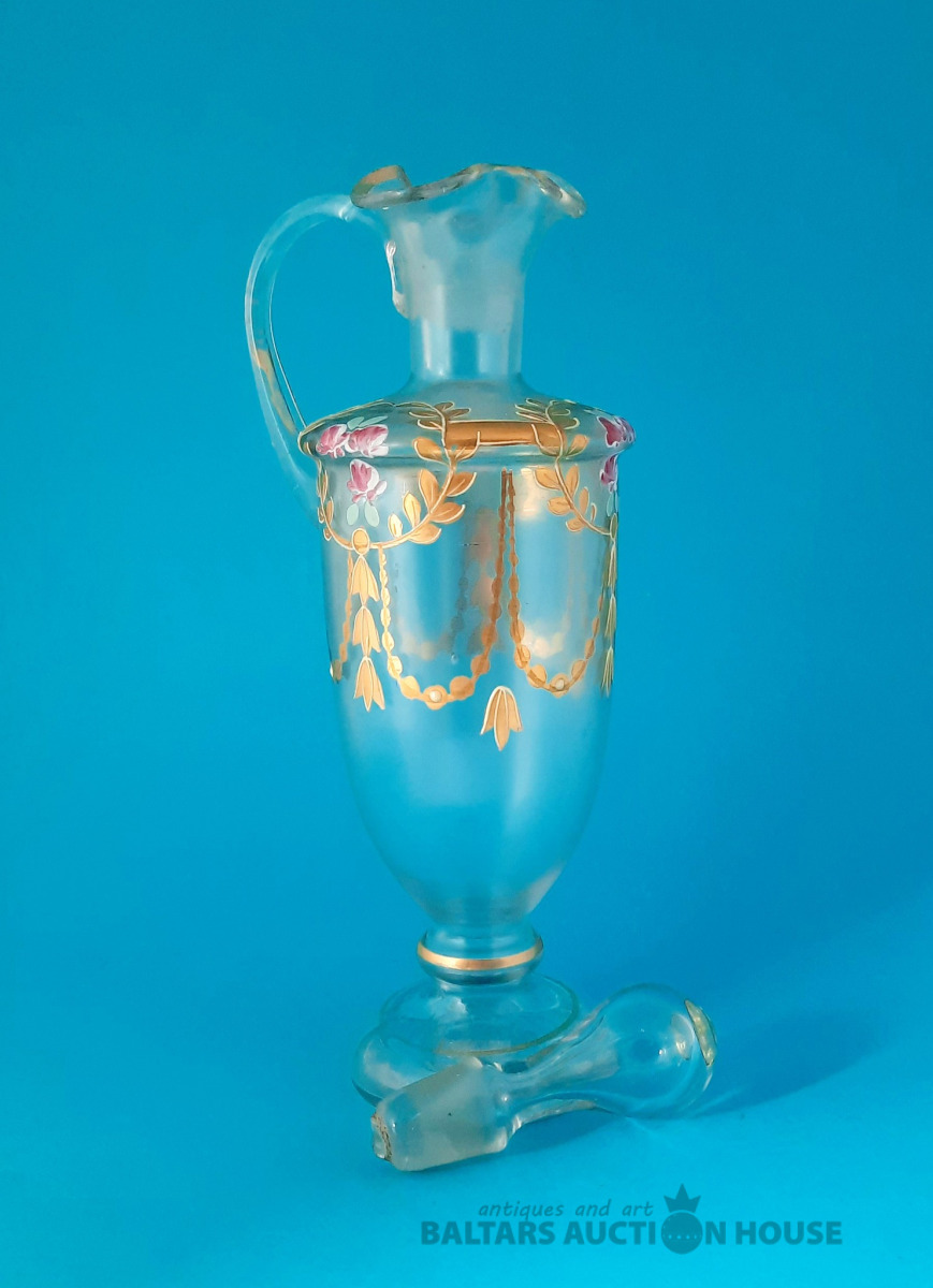 ***Manufaktura FRITZ (Frīdrihs Vilhelms) HECKERT***Krūkas formas dekantere ar korķi. Caurspīdīgs, krāsots stikls, augstums 25 cm. Silēzija, Petersdorfa (tagad Pehovice), ap 1880. gadu. Apaļš, piepūšams kāts; tievs, olveida korpuss ar ziedu rakstu. Caurspīdīgs, C veida rokturis. Īss kakliņš. Piepūšams korķis ar smailu galu.