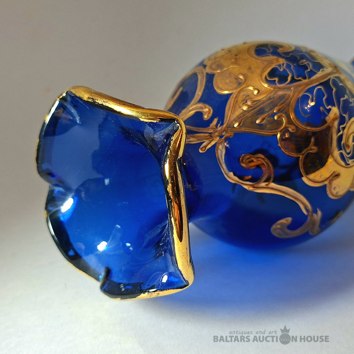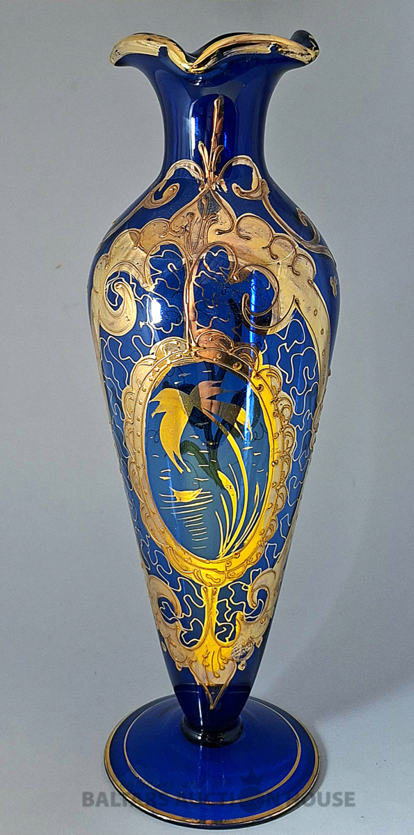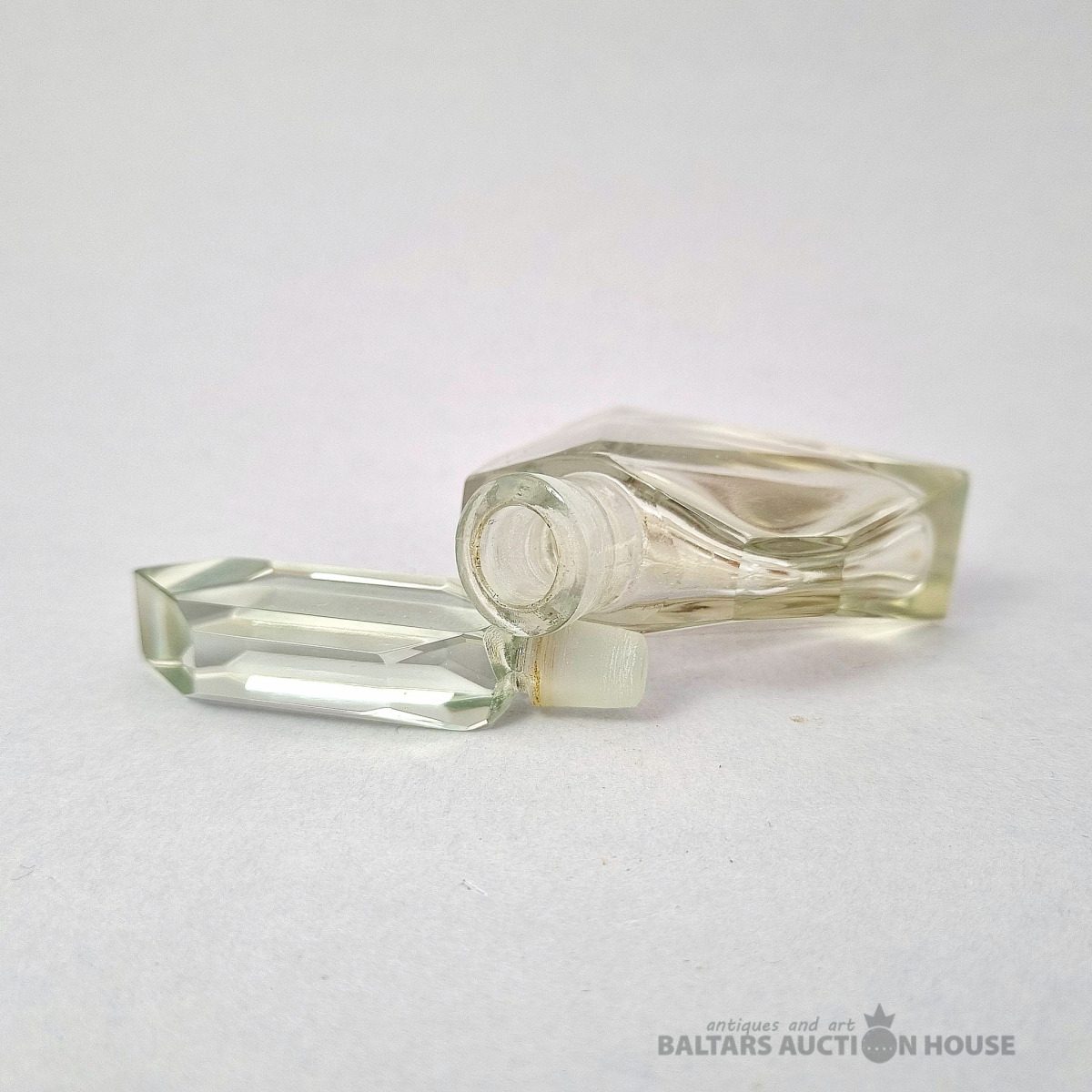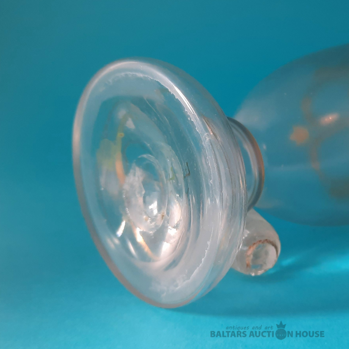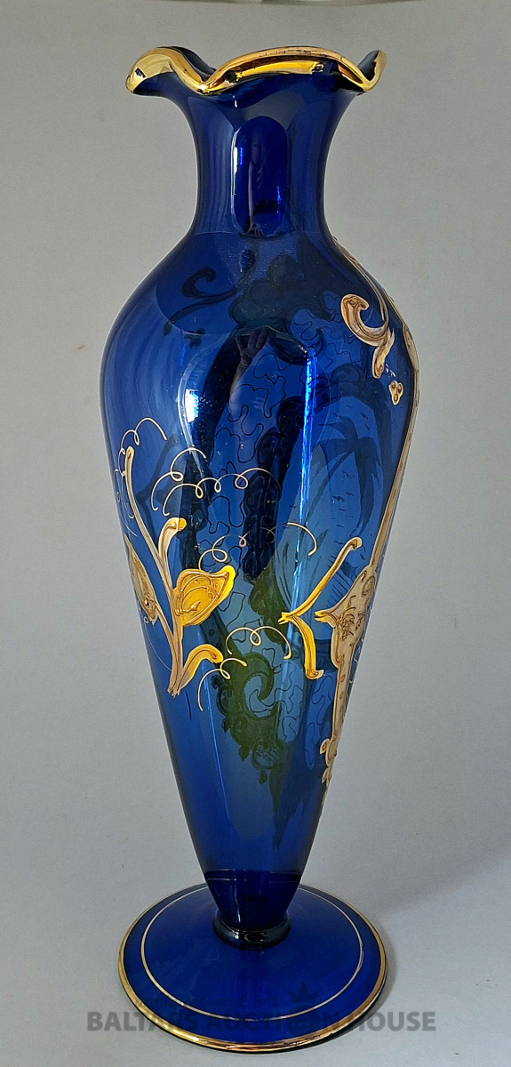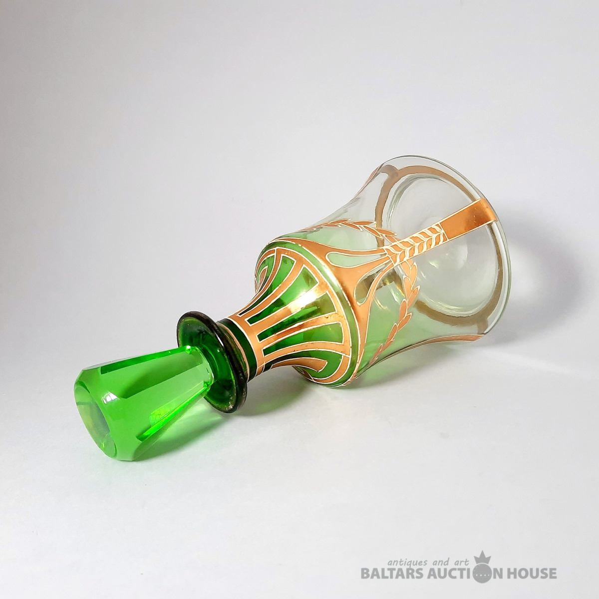 ***Manufaktura FRITZ (Frīdrihs Vilhelms) HECKERT***Krūkas formas dekantere ar korķi. Caurspīdīgs, krāsots stikls, augstums 25 cm. Silēzija, Petersdorfa (tagad Pehovice), ap 1880. gadu. Apaļš, piepūšams kāts; tievs, olveida korpuss ar ziedu rakstu. Caurspīdīgs, C veida rokturis. Īss kakliņš. Piepūšams korķis ar smailu galu.