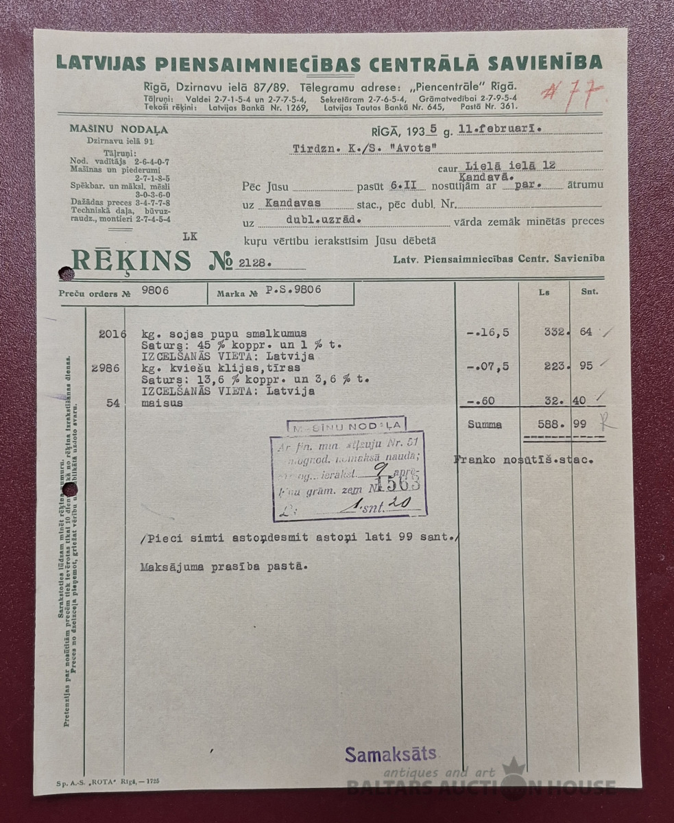 Rēķins. Latvijas piensaimniecības centrālā savienība, 1935g.