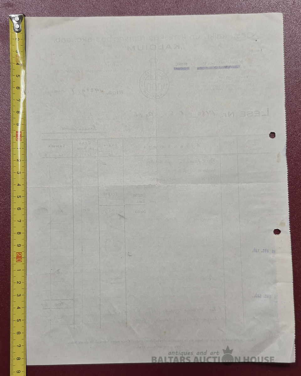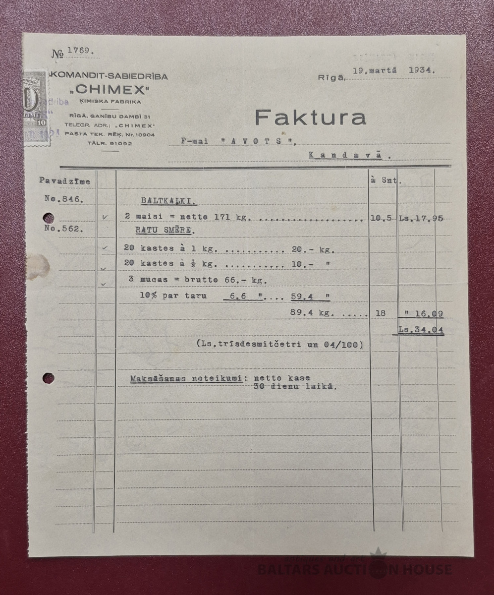 Faktura. Ķīmiskā fabrika "Chimex", 1934g.