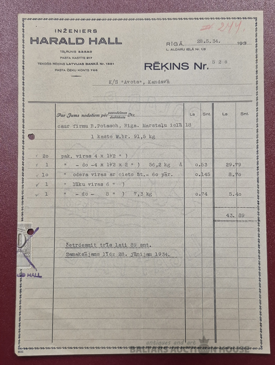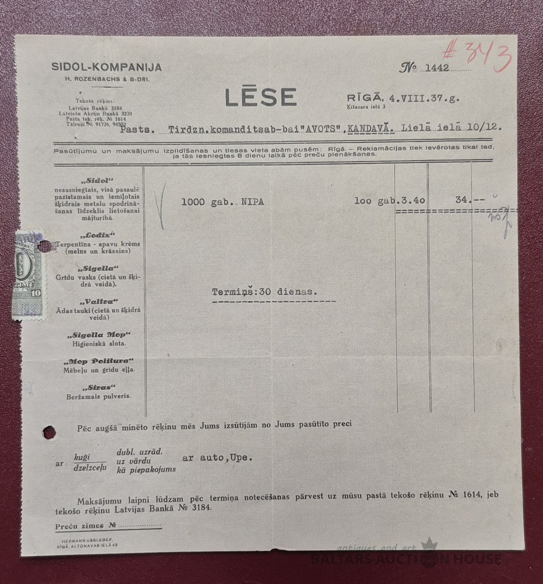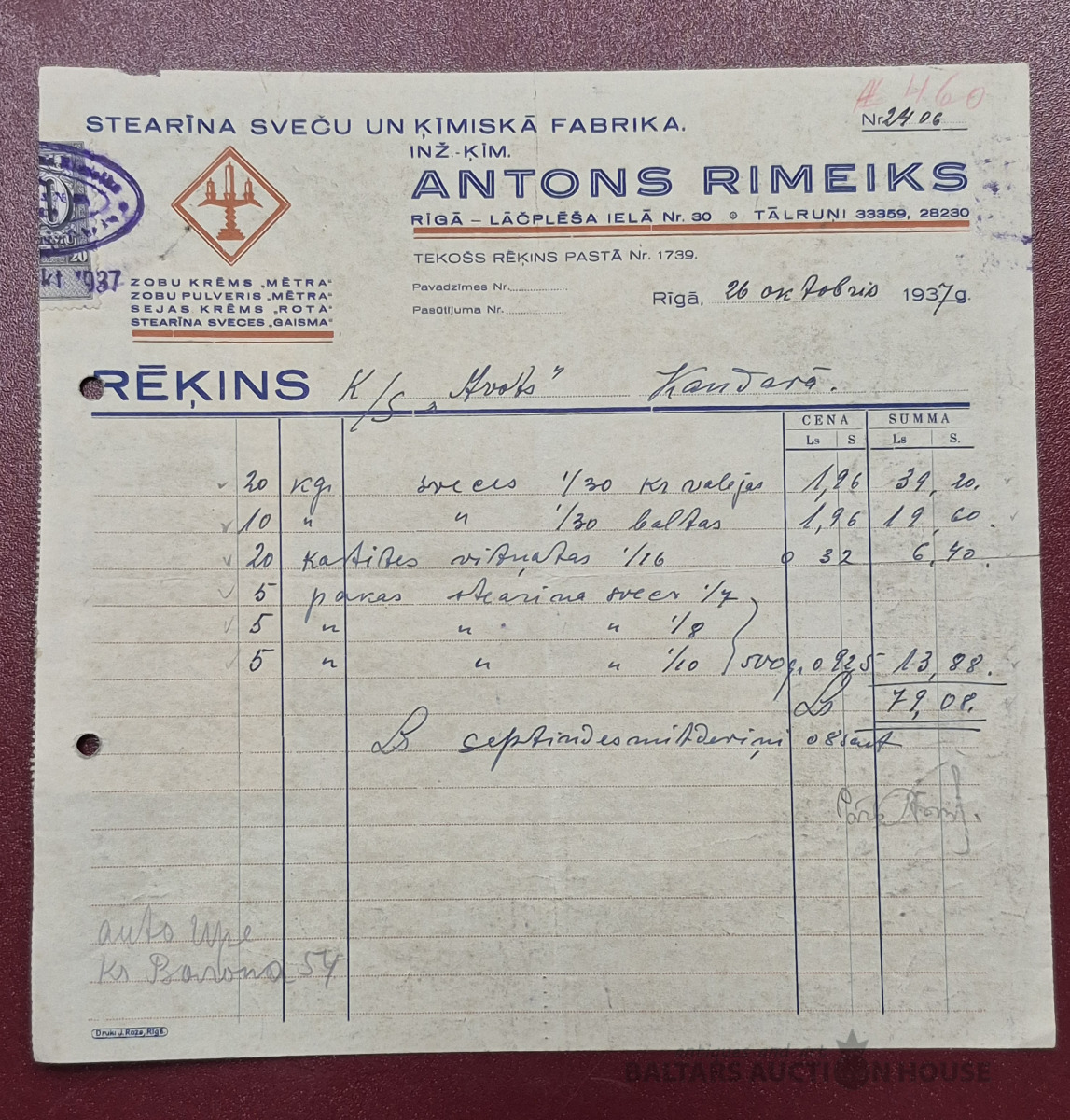 Rēķins. Stearīna sveču un ķīmiskā fabrika inž.-ķīm. "Antons Rimeiks", 1937g.