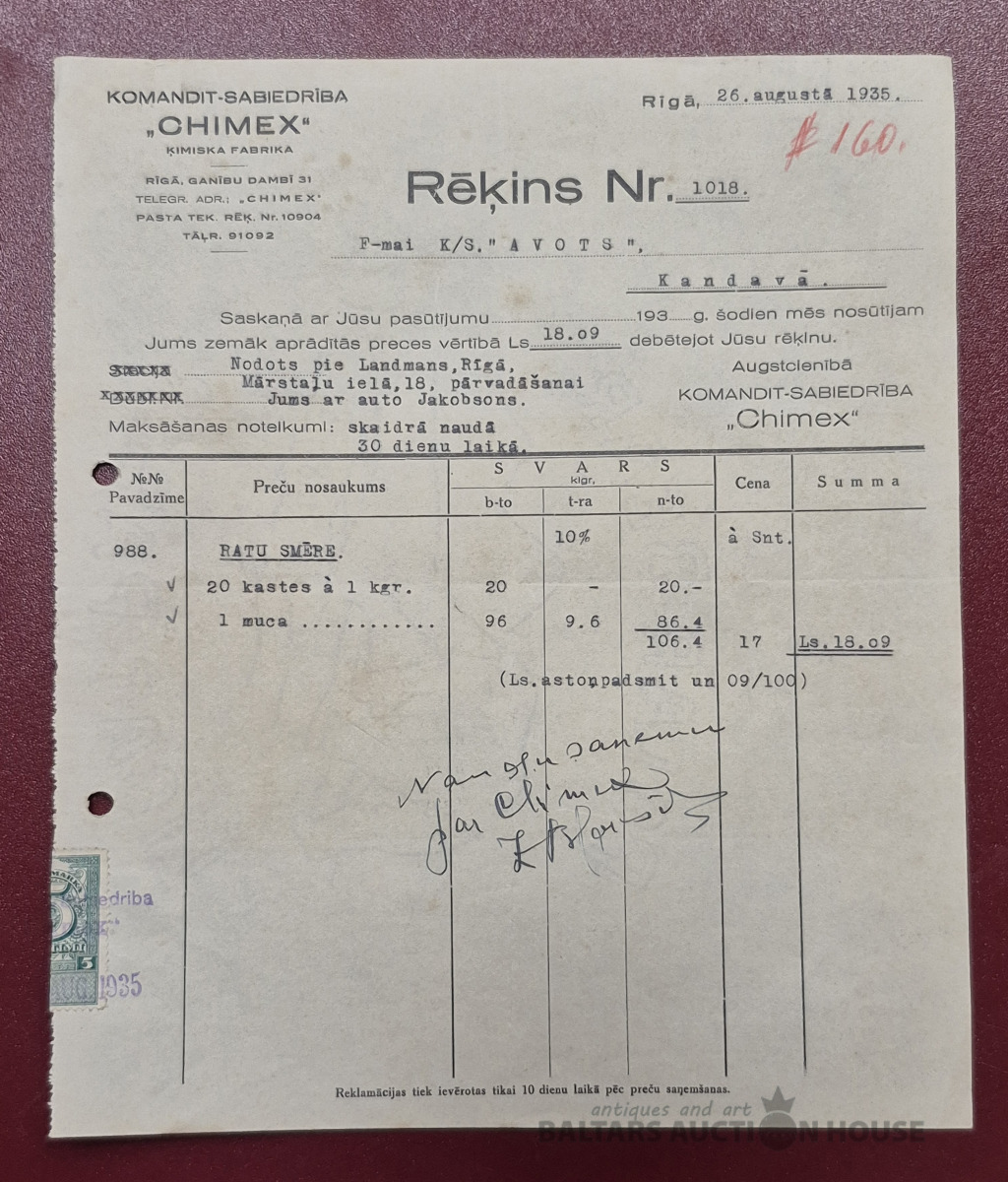Rēķins. Ķīmiskā fabrika "Chimex", 1935g.