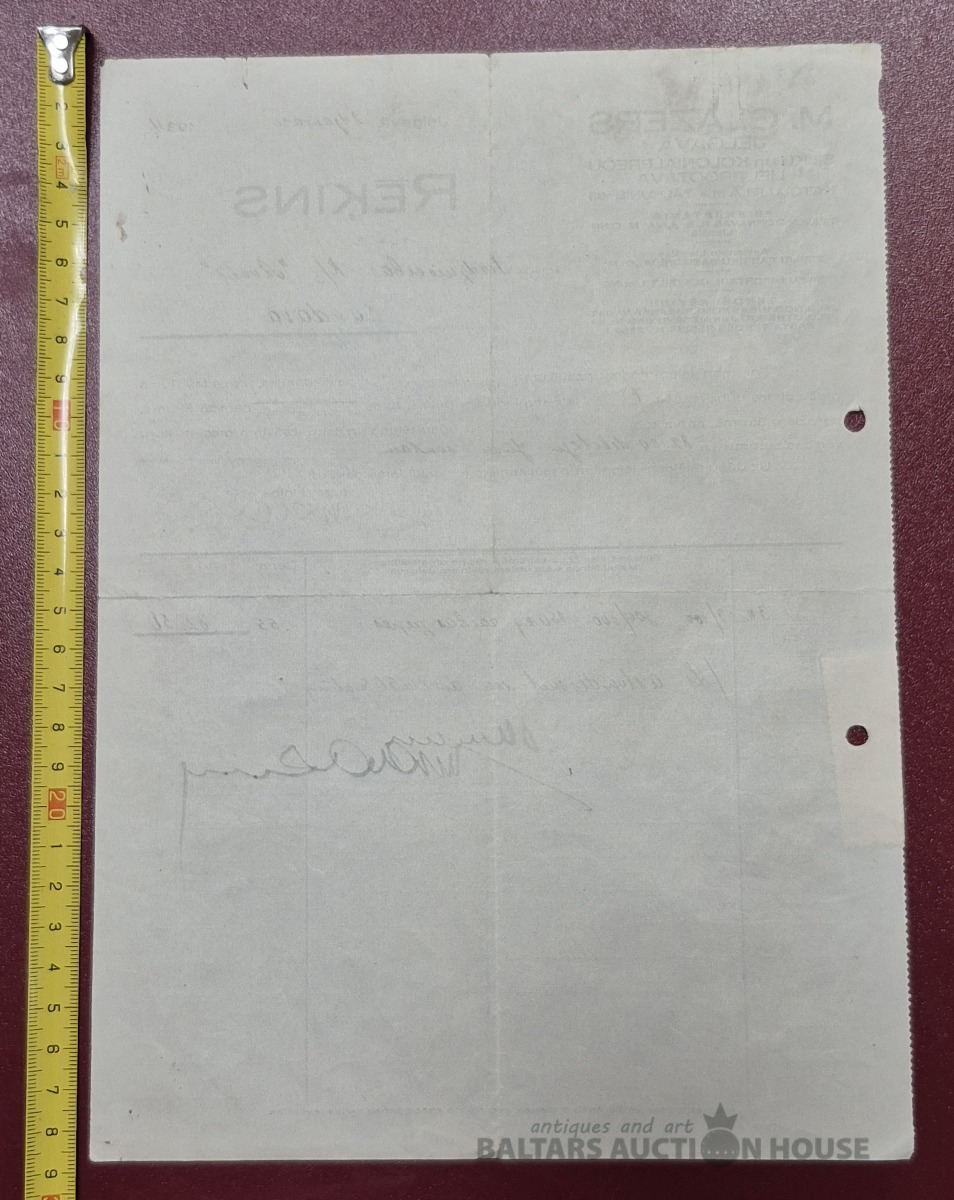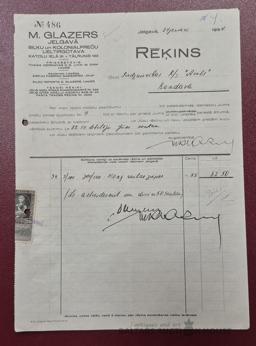 Rēķins. Siļķu un kolonialpreču lieltirgotava "M. Glazers", Jelgavā, 1934g.