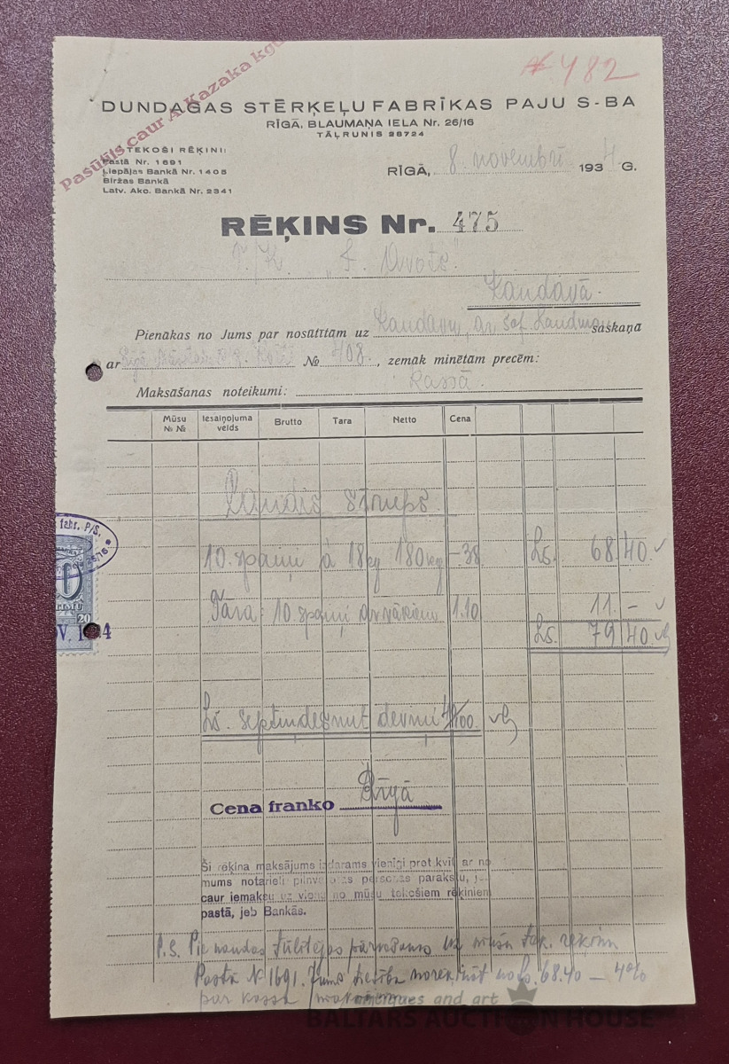 Rēķins. Dundagas stērķeļu fabrika, 1934g.