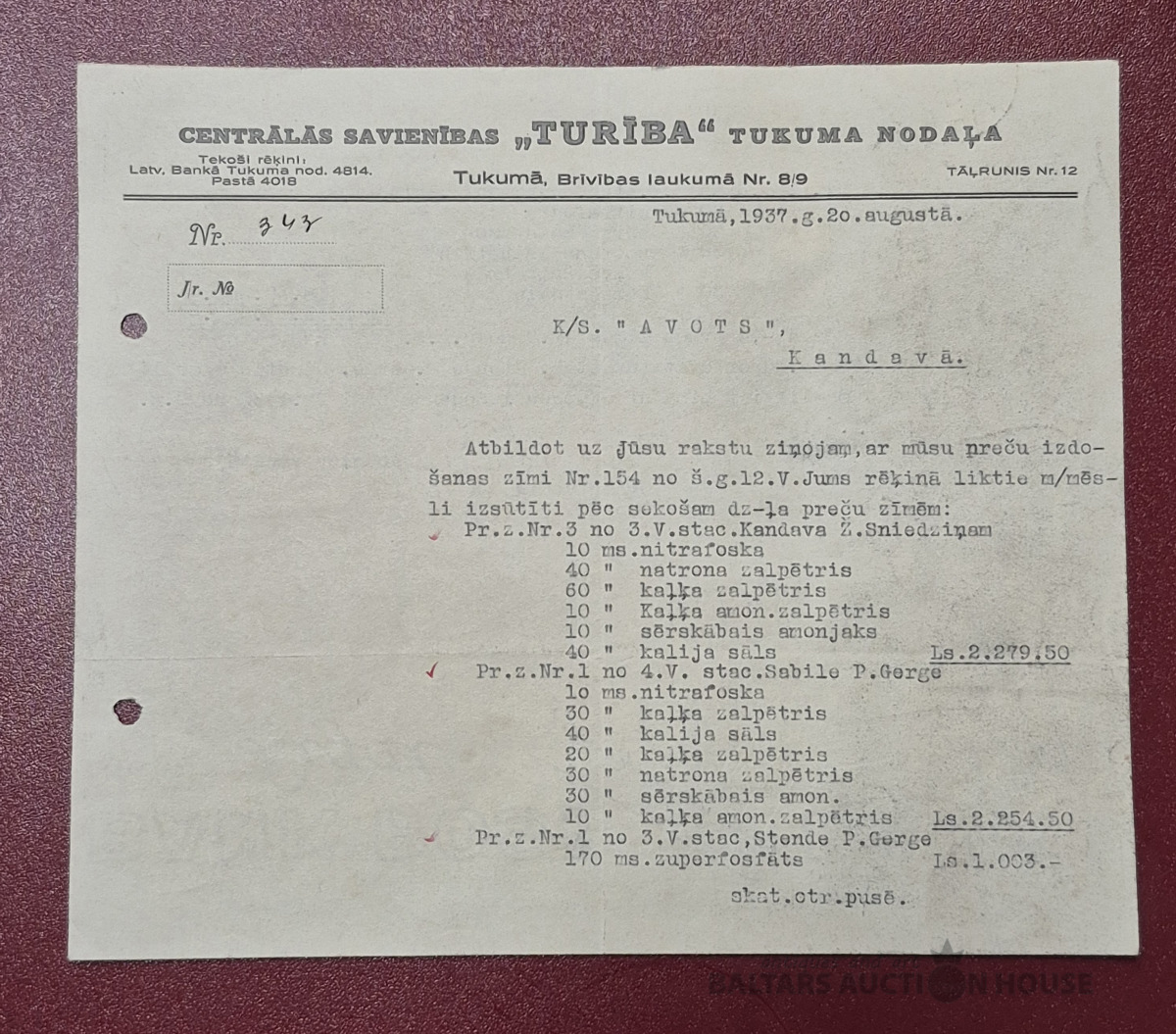 Dokuments. Centrālās sav."Turība ", Tukuma nodaļa., 1937g.