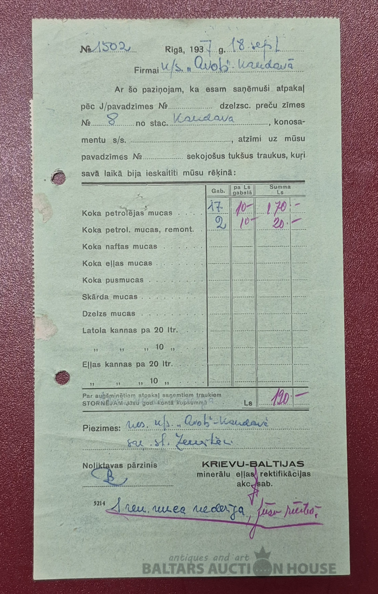 Rēķins. Krievu-Baltijas minerālu eļļas rektifikācijas A/S.