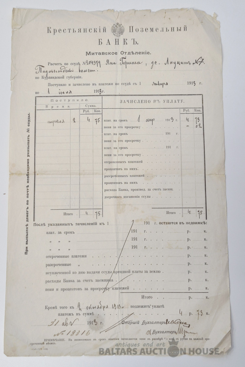 Расчёт по ссуде. Крестьянской Поземельный Банк. Митавский отделение, 1913г.