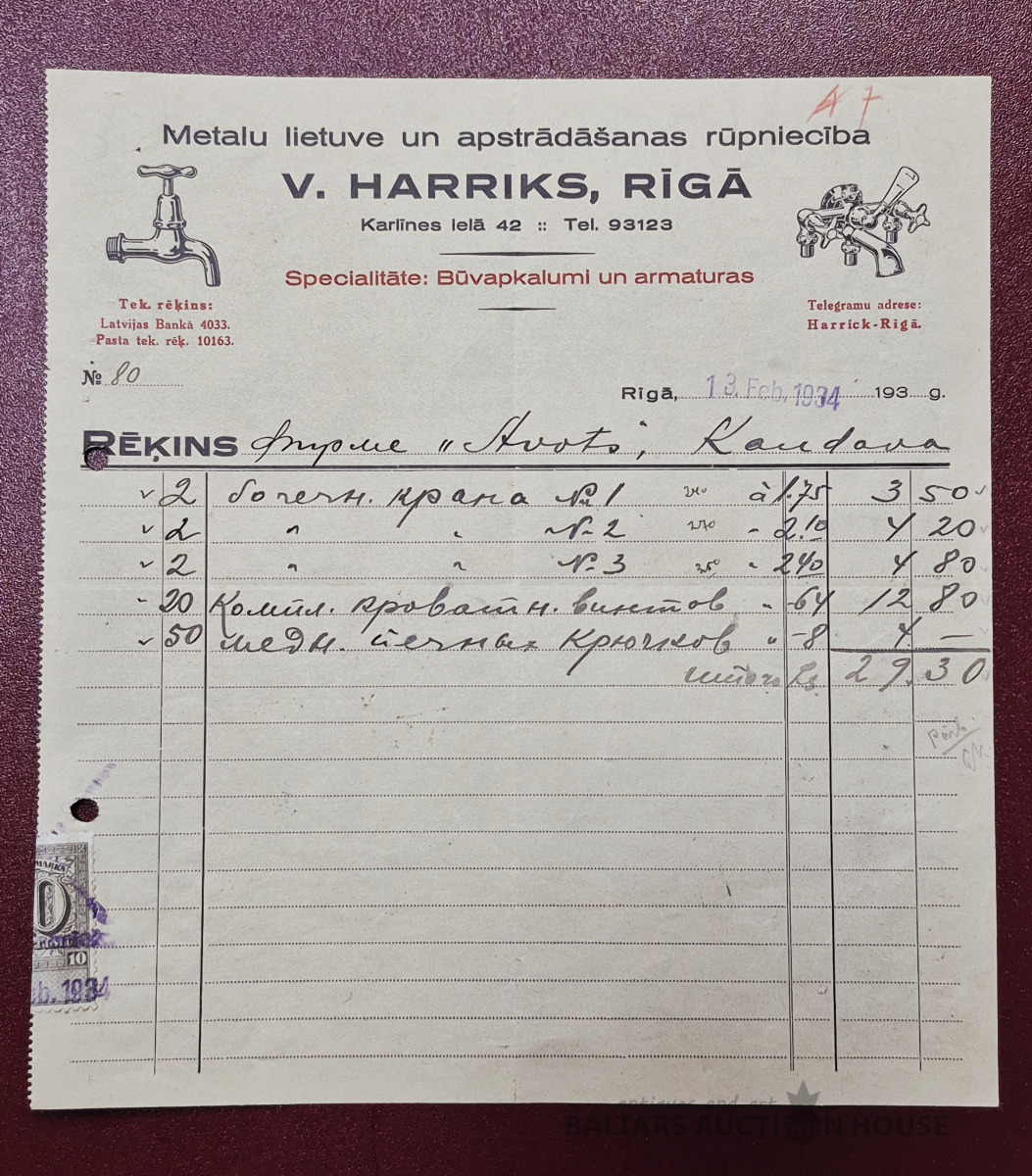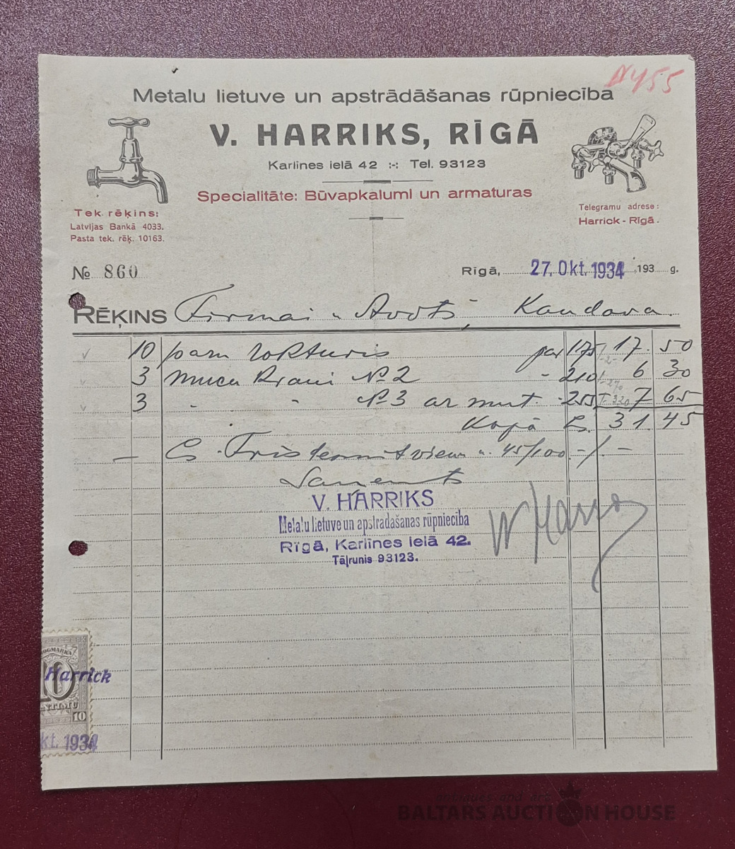 Rēķins. Metalu lietuve un apstrādāšanas rūpniecība " V. Harriks", Rīgā, 1934g.