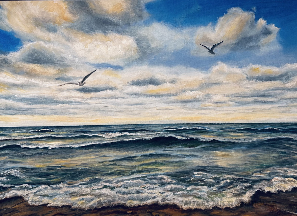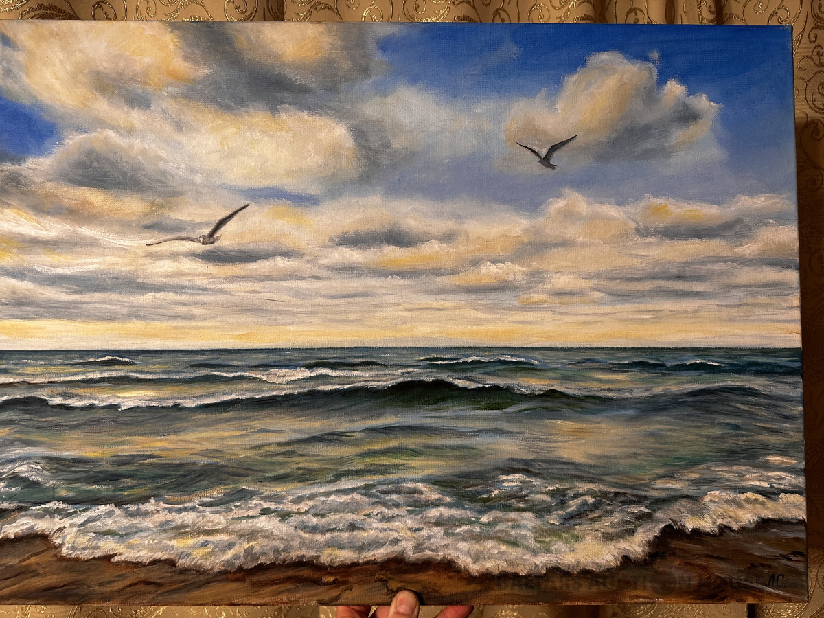 Glezna JŪRA, eļļa, audekls, parakstīta, 21.gds., gleznota Ventspilī, lielums 50x70 cm, ierāmēta masīvā senā koka rāmī ar profilu 70x50 mm.