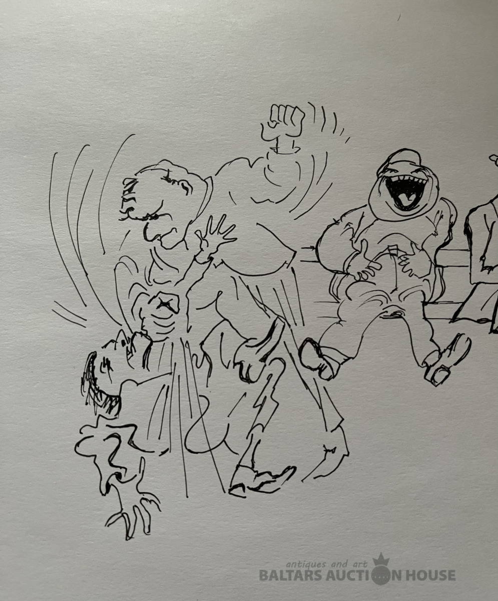 Bidstrups smejas. Smejas par Bidstrupu. Tušas zīmējums A 4