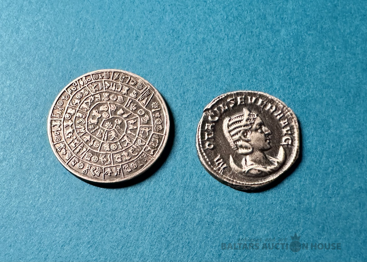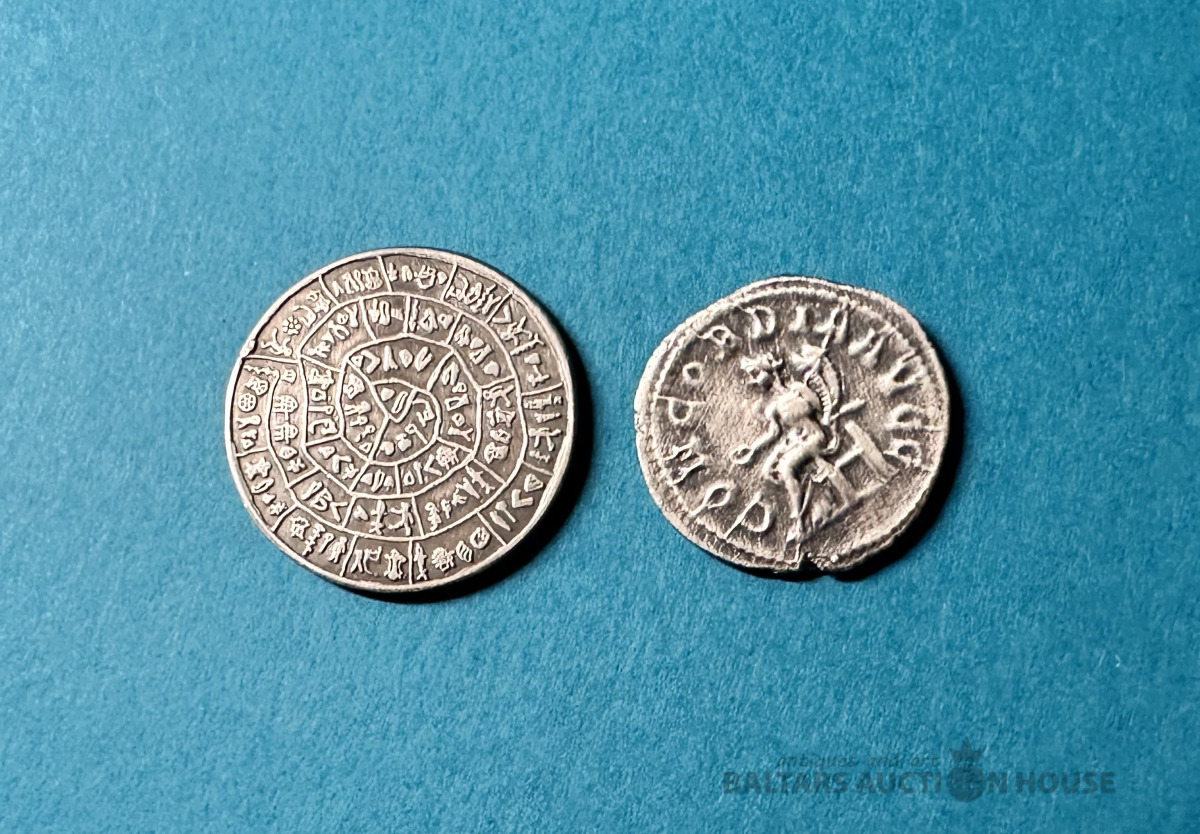 Divas sudraba monētas, replikas?, sudraba saturs ap 900 provi, Grieķija un Kanāda, svars 6.82 grami un 3.37 grami, diametrs 25.2 mm un 21.2 mm.