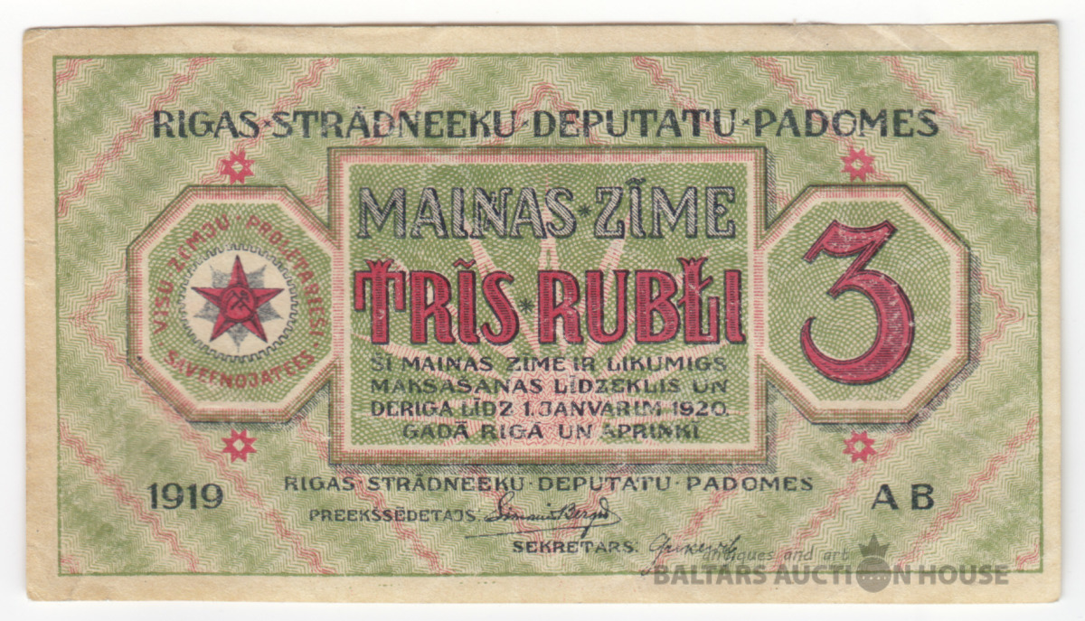 Banknote, Latvija 3 Rubli, Rīgas strādnieku deputātu padomes naudas zīme. aUNC