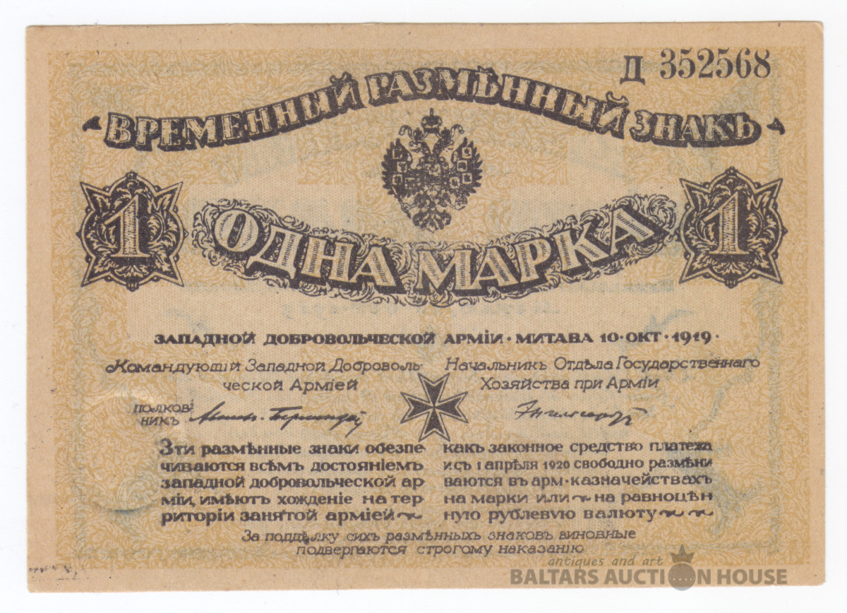 Banknote Latvija/Mītavā(Jelgavā) Rietumu brīvprātīgo armija, Bermondt, 1Marka 1919, UNC