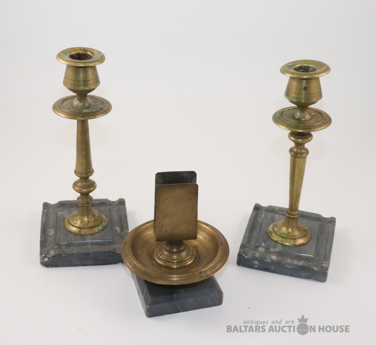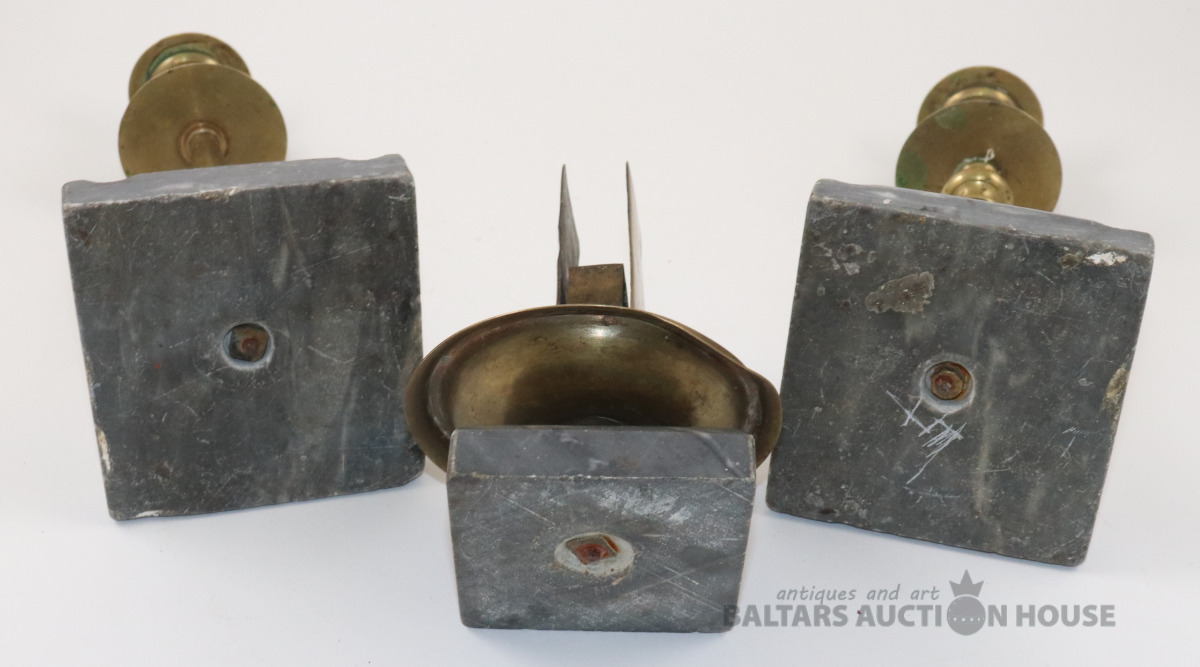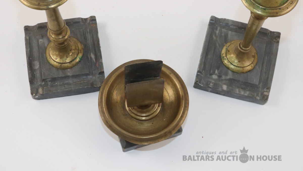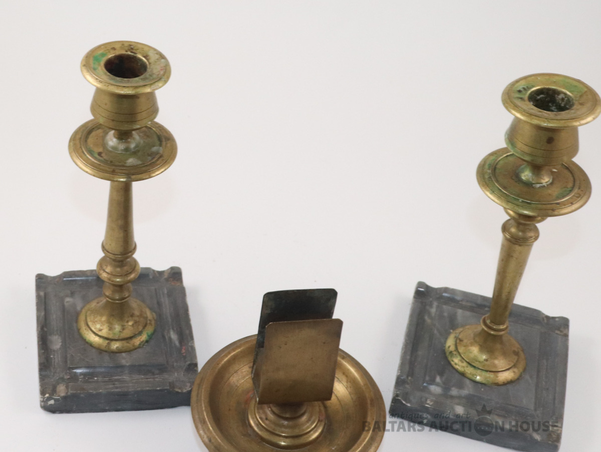 Svečturi 2 gab. un sērkociņu kastītes turētājs. Misiņš. h=12 un 20 cm